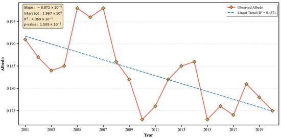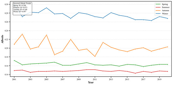 Seasonal differences were also evident, with mean values ranked as winter > autumn > spring > summer [32]. Declines were most pronounced in autumn and winter, whereas spring remained nearly stable and summer showed only slight fluctuations [33]. This indicates that non-growing or snow-covered seasons play a dominant role in annual albedo decline [34].