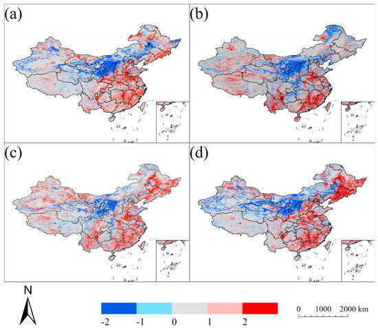 Between 2001 and 2020, surface albedo in China exhibited pronounced regional differentiation, displaying an overall pattern of “decreasing in the north and increasing in the south” (Figure 3). In the northeastern, northern, and northwestern regions, albedo generally showed a significant decreasing trend, with the most pronounced declines observed in the North China Plain and northeastern China. These decreases likely reflect the combined effects of urban expansion, intensified land use, and reductions in snow and ice cover on the surface energy balance. In contrast, the middle and lower reaches of the Yangtze River, southern China, and the southeastern coastal regions exhibited significant increases in albedo, indicating notable changes in surface properties driven by rapid urbanization and ecological restoration projects. The Qinghai–Tibet Plateau and northwestern arid regions displayed more complex spatial patterns, with both decreases (due to glacier and snow melt) and increases (associated with bare land and desert expansion) in albedo. This spatial heterogeneity underscores the integrated influence of climate change and human activities on surface albedo across China.