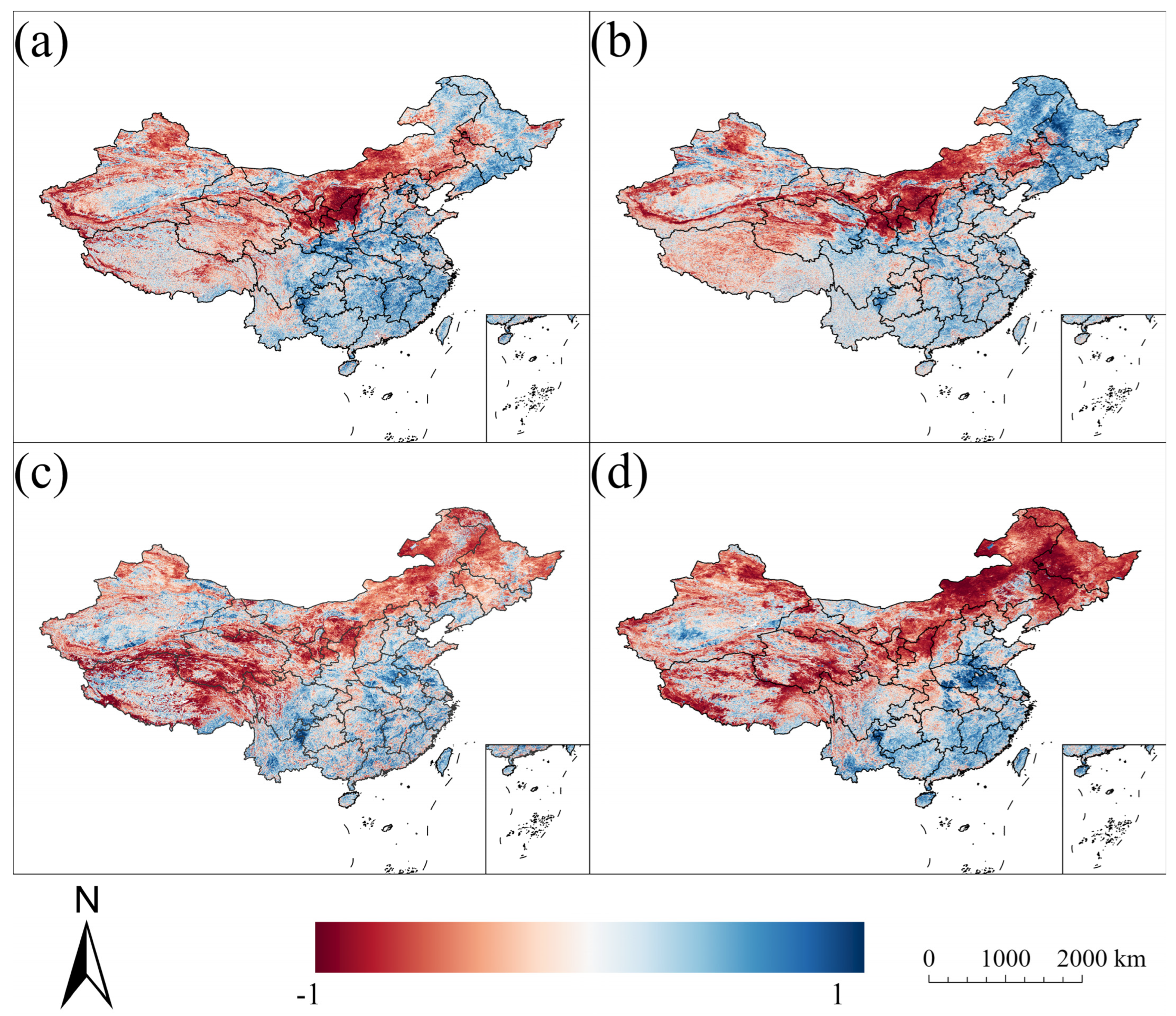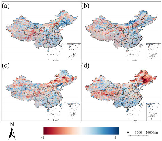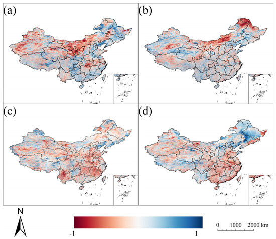 As shown in Figure 6, distinct seasonal patterns characterize the long-term trends of surface albedo across China. In spring, significant decreases (blue areas) are observed over the North China Plain, the Huang–Huai–Hai region, and parts of northwestern China (northern Shaanxi, Shanxi, and northern Henan), while marked increases (red areas) occur across the middle and lower reaches of the Yangtze River, South China, the southeastern coastal areas, and southwestern provinces such as Sichuan, Guizhou, and Yunnan. This clear north–south contrast is likely related to the delayed onset of vegetation greening in northern regions. In summer, extensive decreases dominate northeastern China, North China, the Loess Plateau, and northern Xinjiang, whereas large-scale increases are concentrated in the Yangtze River basin, South China, and East China. The spatial extent of albedo decline is the broadest in this season, probably because croplands in Northeast and North China are in peak growing stages, with increased leaf area index enhancing absorption and thus lowering albedo, while irrigated paddy fields in the south may lead to increased albedo. In autumn, surface albedo generally increases across the south, including the Yangtze River basin, South China, and the southwest, but decreases persist in the North China Plain and the Loess Plateau. In winter, widespread decreases occur in the North China Plain, the Loess Plateau, and Northeast China, making this season the most prominent period of albedo reduction nationwide. Conversely, significant increases are observed in southern regions such as South China, the lower Yangtze, and the southeastern coast. These wintertime contrasts are closely associated with snow cover dynamics and vegetation conditions.