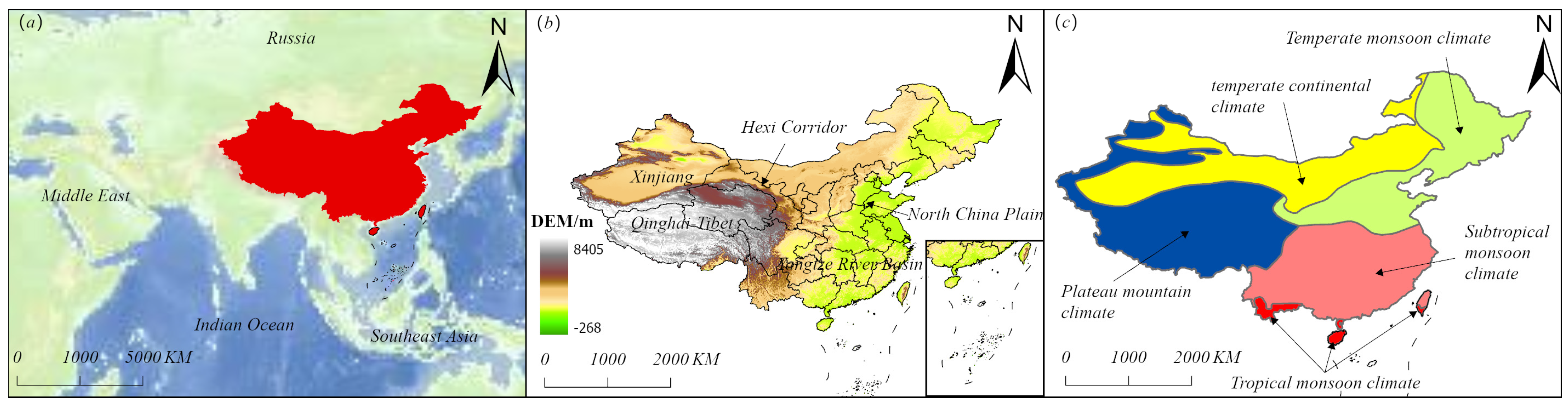 The study area encompasses the entirety of China (73°40′–135°05′ E, 3°51′–53°33′ N), with a terrestrial area of approximately 9.6 million km2 and a territorial sea area of about 4.73 million km2 (Figure 1), making it the third-largest country in the world by area. The region spans approximately 5200 km from east to west and 5500 km from north to south, covering five time zones (UTC + 5 to UTC + 9). China’s topography exhibits a distinct three-step staircase pattern: the first step is the Qinghai–Tibet Plateau (average elevation above 4000 m), including the Himalayas and the Kunlun Mountains; the second step consists of the Inner Mongolia Plateau, Loess Plateau, Yunnan–Guizhou Plateau, and others (elevation 1000–2000 m); the third step comprises eastern plains and hilly areas (elevation below 500 m). China’s climate is highly diverse. The eastern monsoon region features temperate, subtropical, and tropical monsoon climates; the northwestern arid and semi-arid region exhibits a temperate continental climate; and the Qinghai–Tibet Plateau and other high-altitude areas experience plateau mountain climates. Annual precipitation decreases from 1500–2000 mm in the southeastern coastal regions to less than 200 mm in the inland northwest. Temperature zones range from cold-temperate to tropical, with mean annual temperatures varying from −5 °C in Mohe to 25 °C in the Nansha Islands.