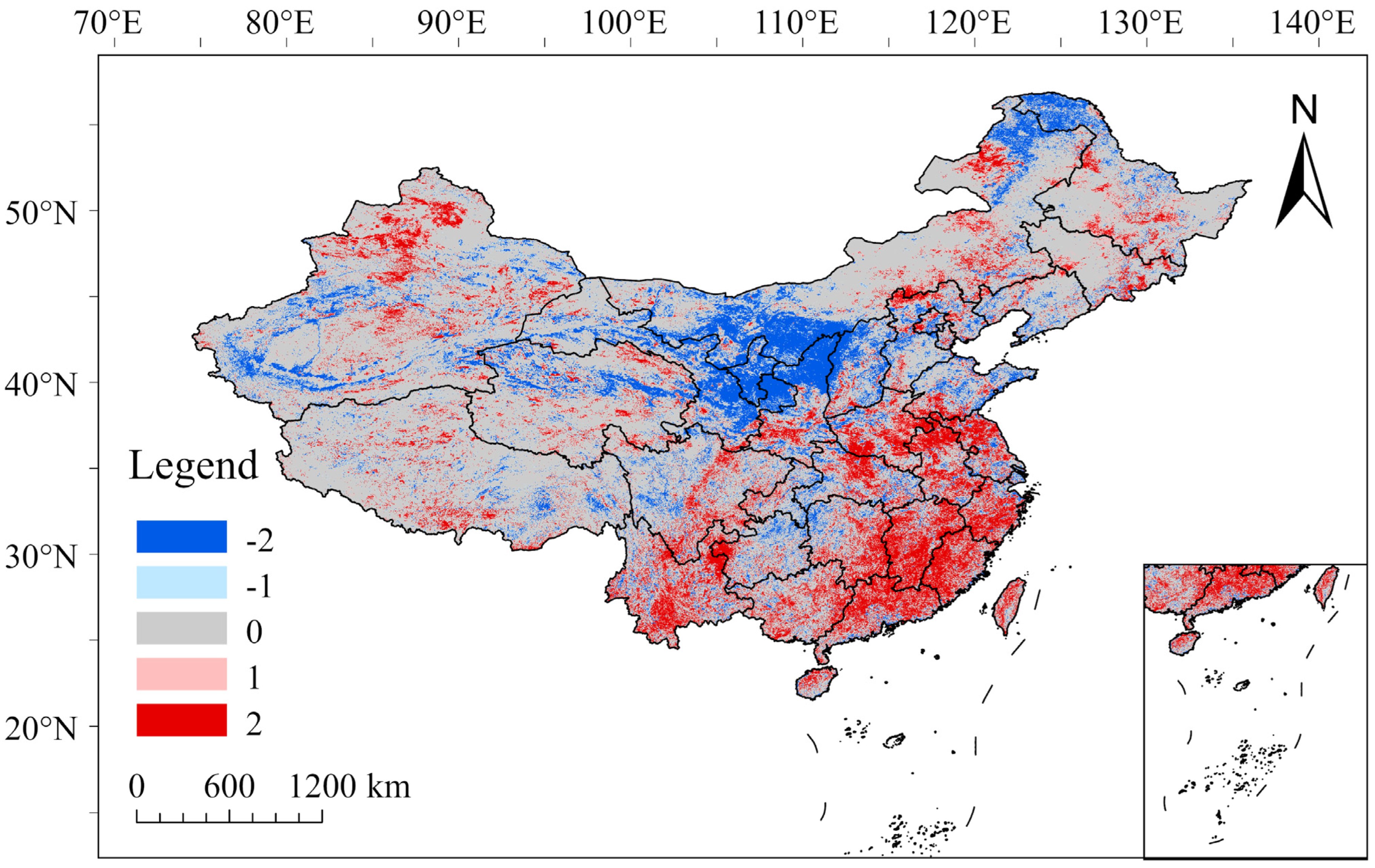 In the equation, and represent the mean values of the factors in year a and year b, respectively; n denotes the length of the time series; refers to the sign function; S is the total sum of the sign values between data pairs; represents the variance of S; p is the number of tied groups; and denotes the number of data points in the j-th group. The significance level is determined using a two-tailed Z-test. When |Z| ≥ 1.65 and 2.58, the null hypothesis is rejected at the 90% and 95% confidence levels, respectively, corresponding to marginally significant and highly significant trends.