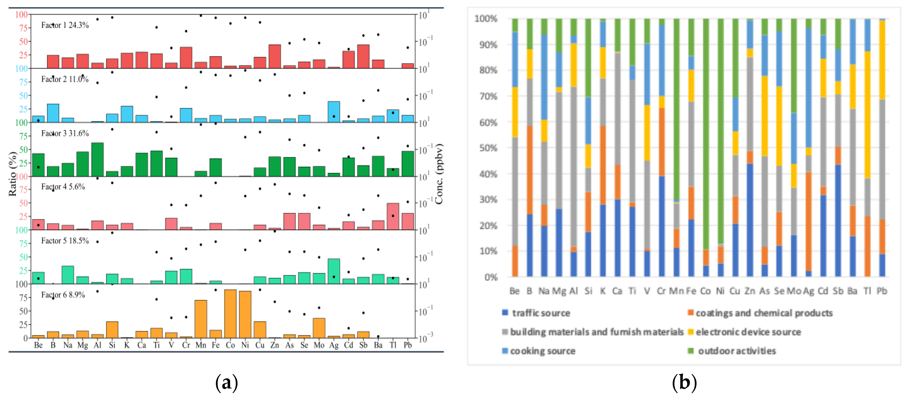 - Niu, Y.; Wang, F.; Liu, S.; Zhang, W. Source Analysis of Heavy Metal Elements of PM2.5 in Canteen in a University in Winter. Atmos. Environ. 2021, 244, 117879. [Google Scholar] [CrossRef]