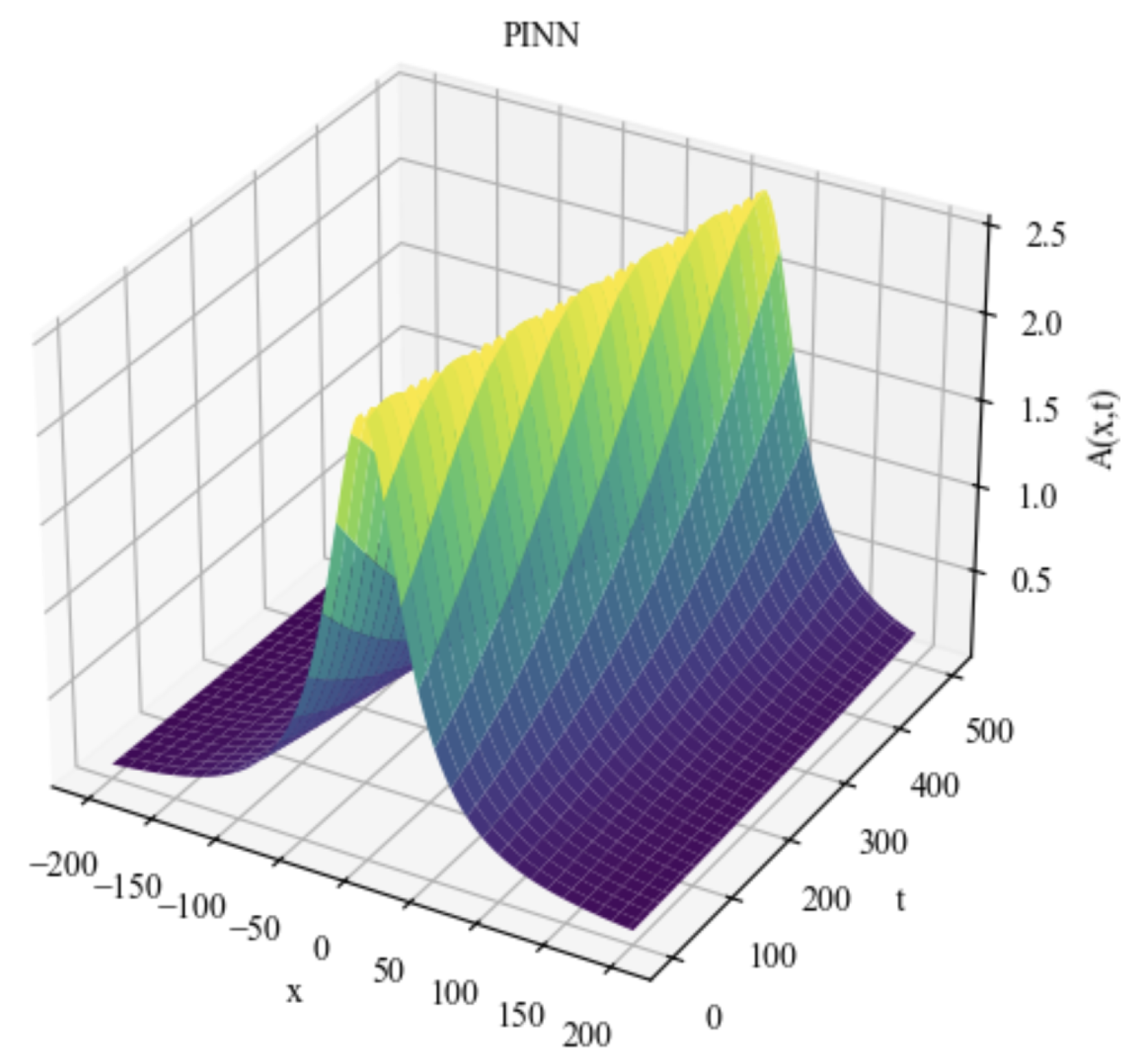 was achieved, which indicates that the PINN can closely capture the soliton chasing behavior of the equation. Here,
