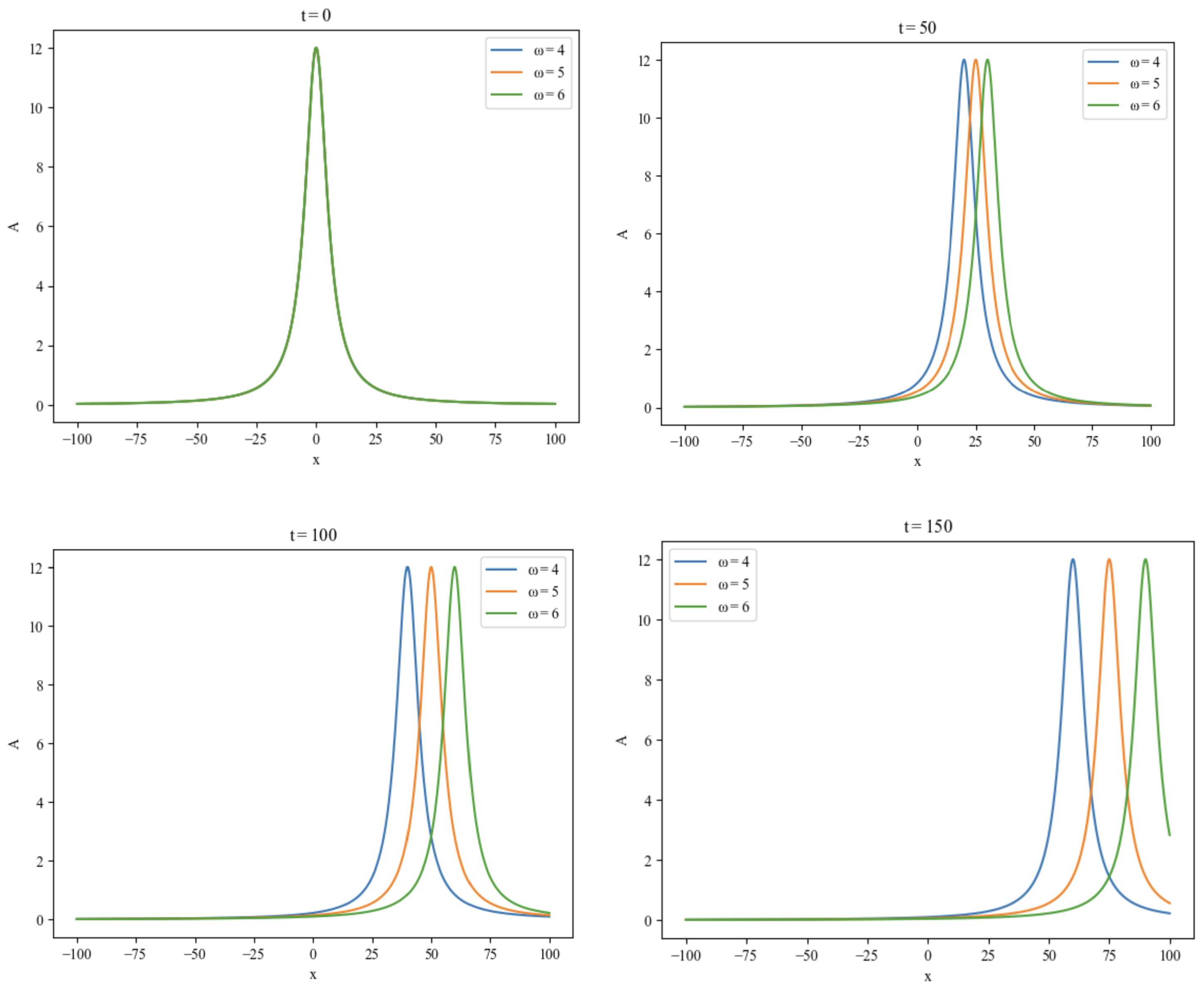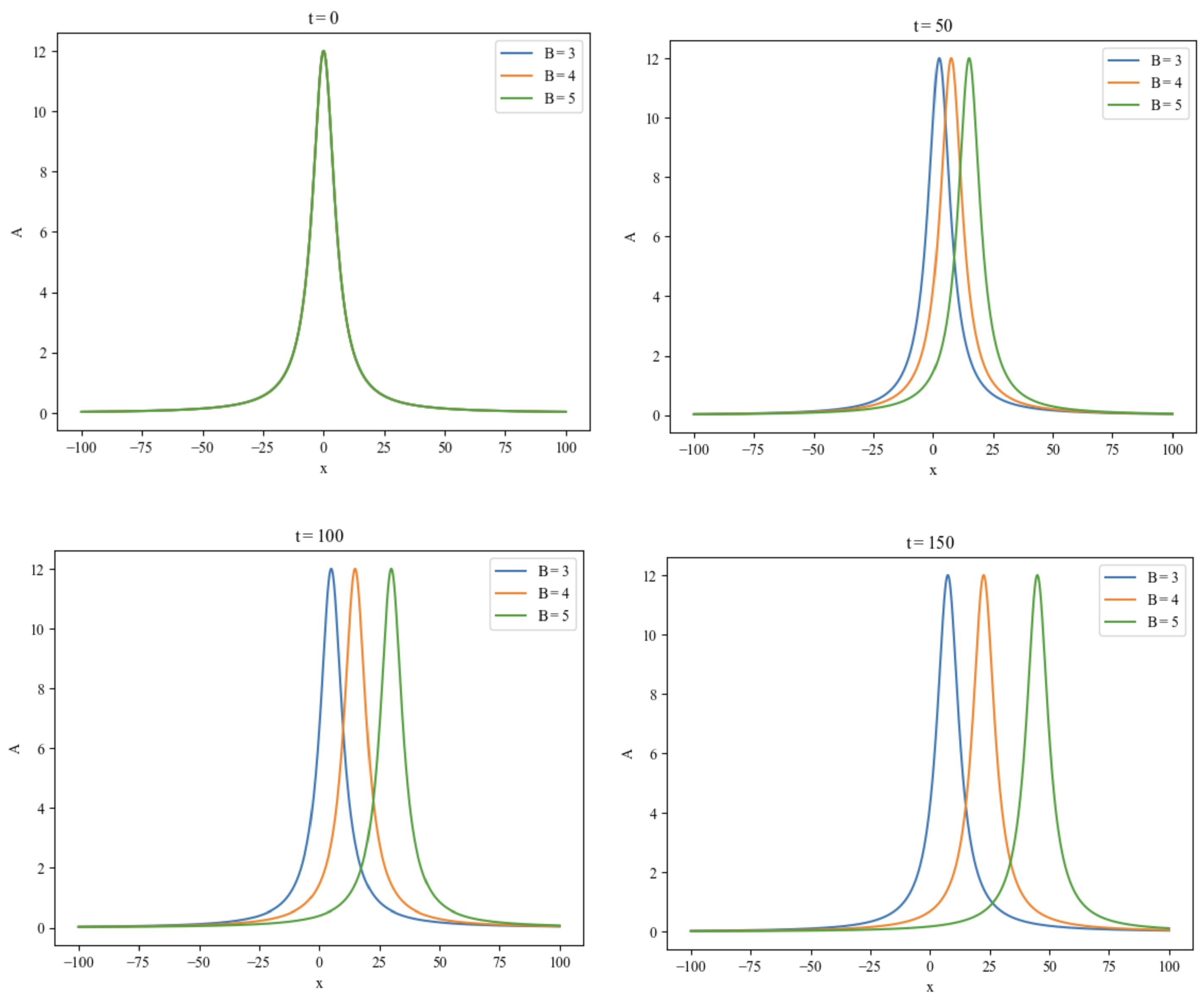 Figure 3 shows the solution of the BDO equation. This equation is often used to describe long waves in shallow water, such as Rossby waves in the atmosphere. From the graph, we can observe that the amplitude