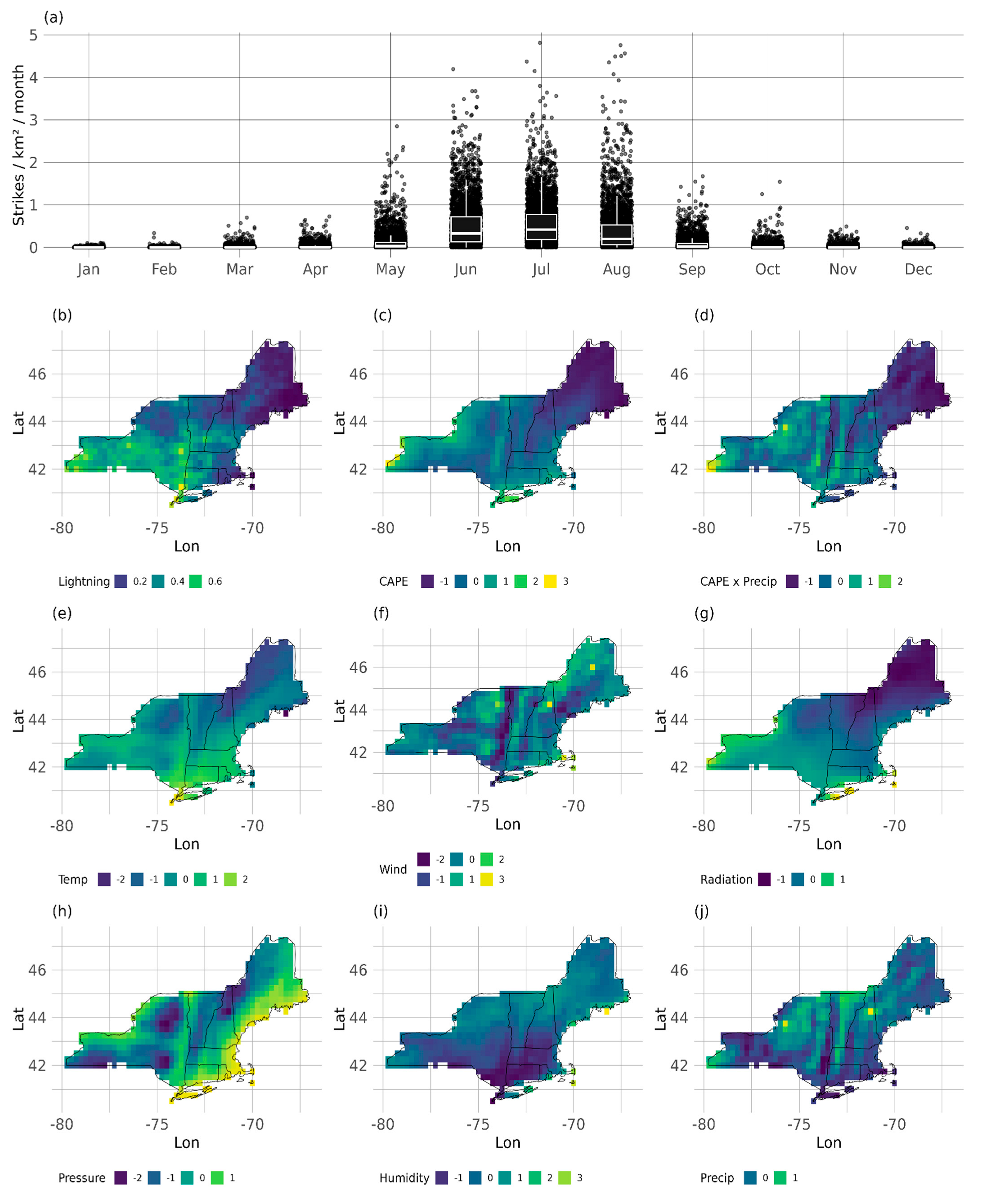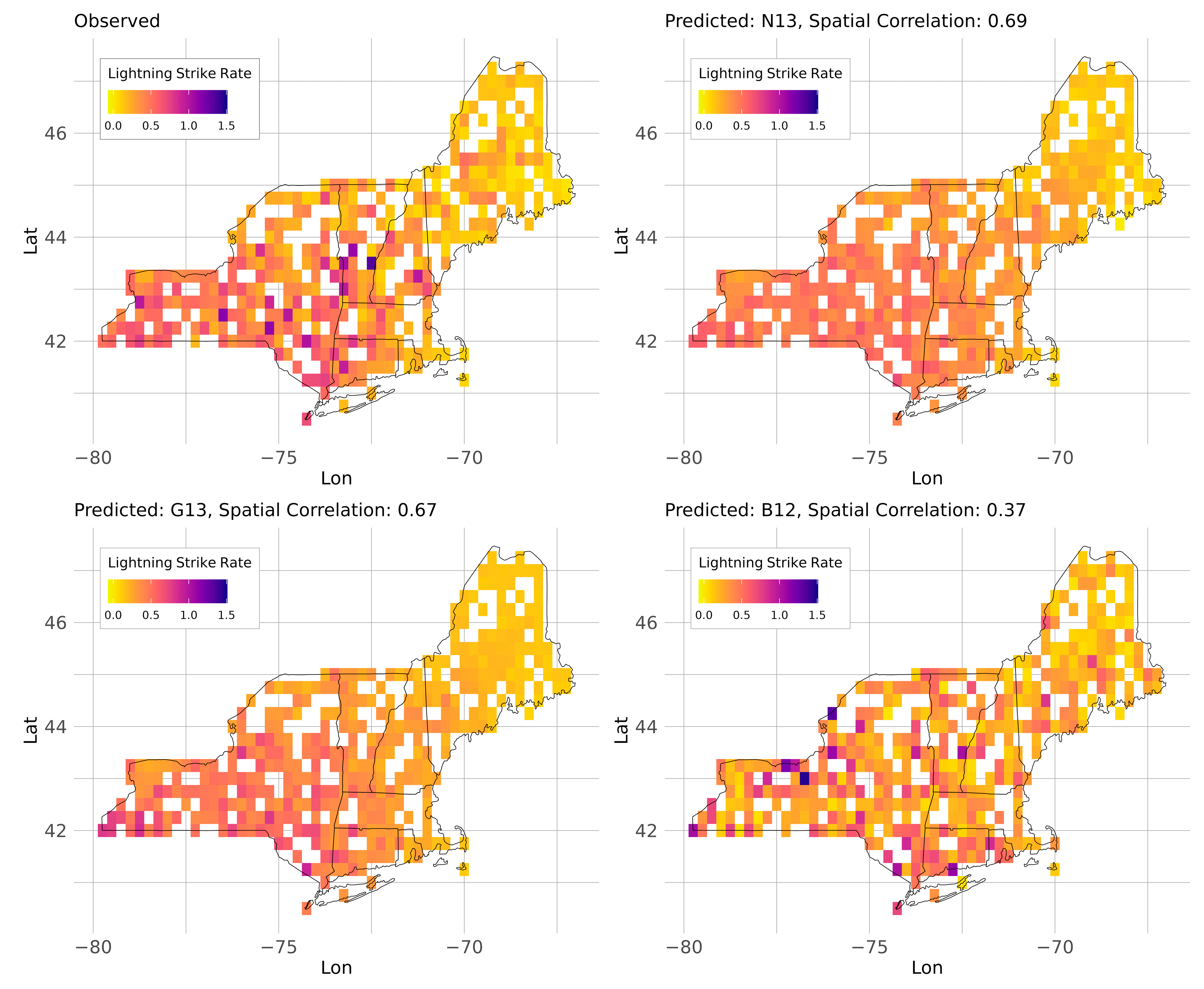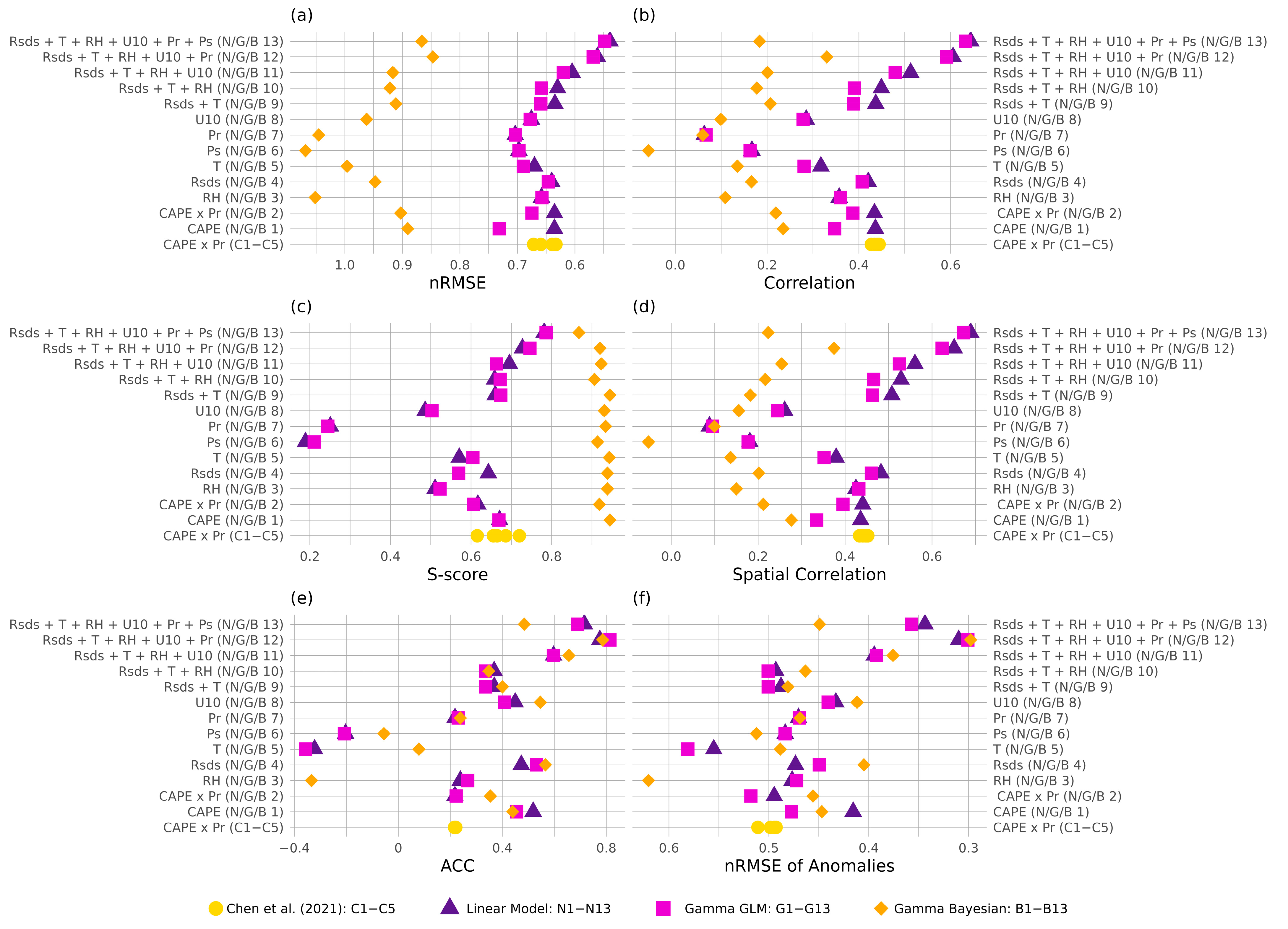 - Precipitation, by contrast, ranked low in both importance and predictive skill when used alone. While precipitation is often used as a proxy for convective activity, its poor performance here may come from two factors. First, aggregating to a seasonal scale smooths out storm-level events. Second, the ERA5 precipitation data we used includes both convective and stratiform components [27]. Including stratiform precipitation, which is not usually associated with lightning, likely dilutes the signal.