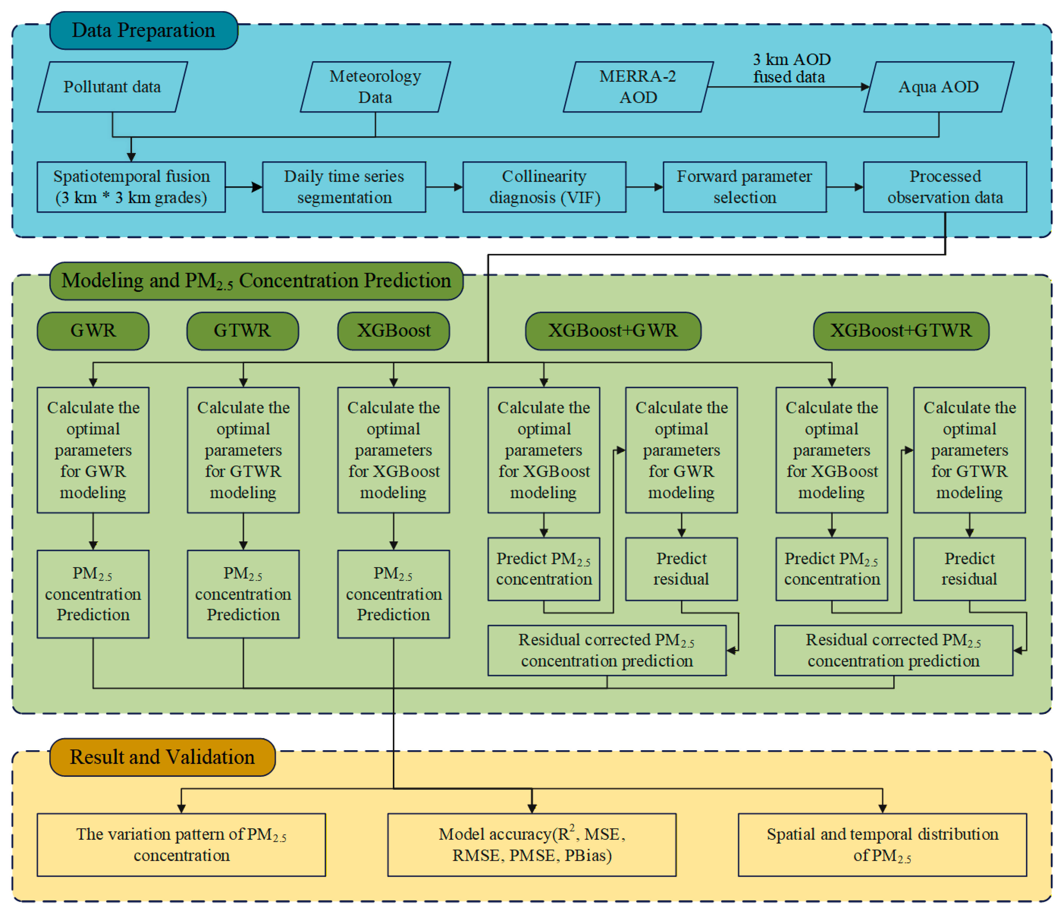 2.5 prediction. Second, the fused AOD data is incorporated into a two-stage nonlinear and spatiotemporal residual correction framework, which simultaneously captures nonlinear effects and spatiotemporal dependence, thus improving the robustness of the model.