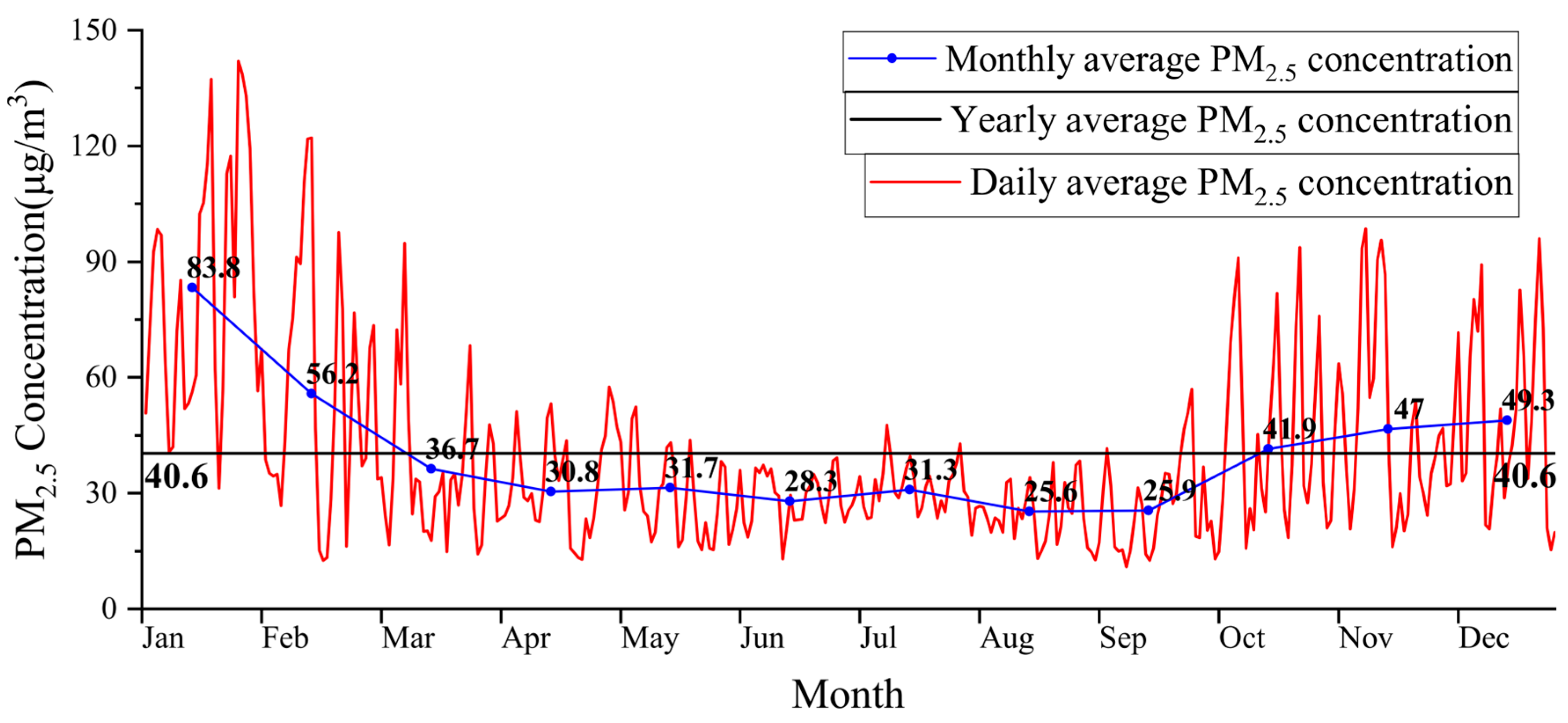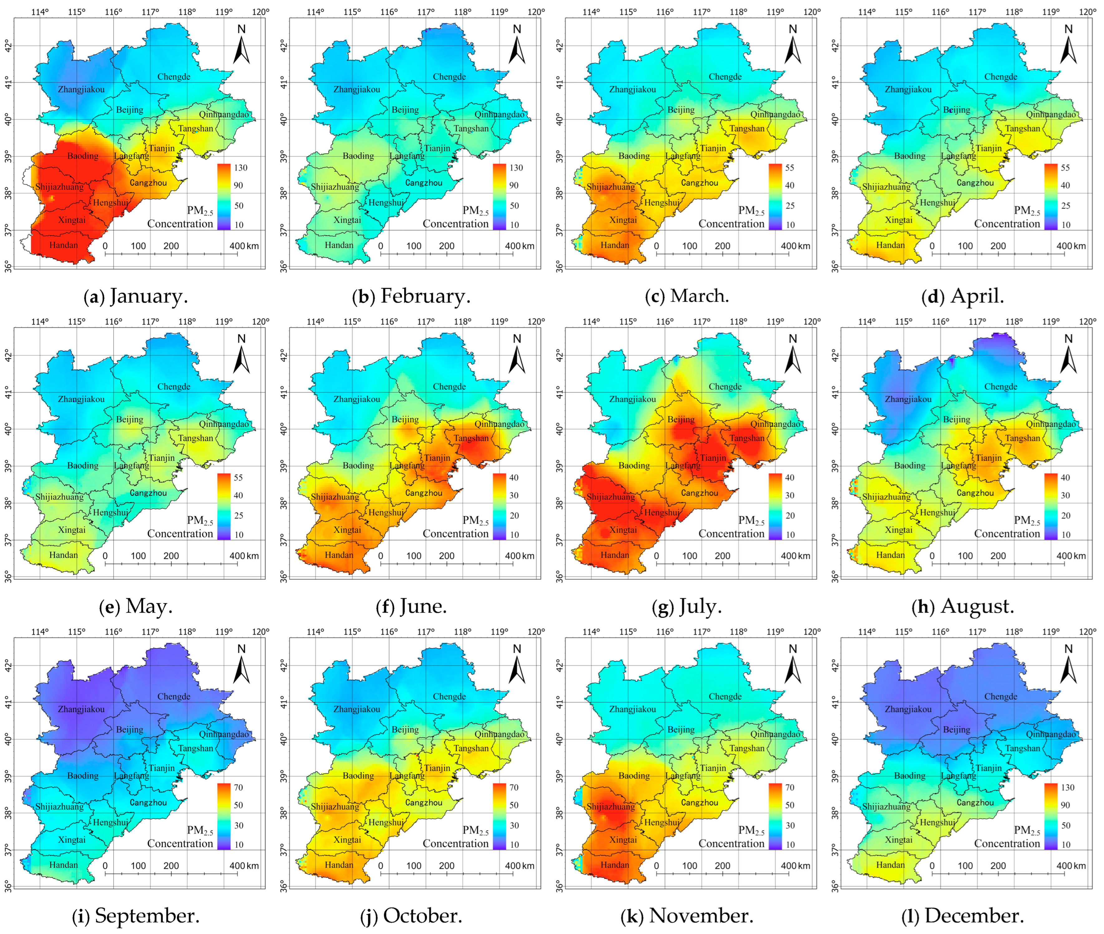 The trend in PM2.5 concentrations across the Beijing–Tianjin–Hebei region demonstrates a gradual decline from January to August, followed by a subsequent gradual increase until December. The highest average concentration recorded in January exceeds the lowest average concentration recorded in August by more than threefold. This is largely attributable to the fact that the southeasterly monsoon in summer facilitates the dispersion of PM2.5, whereas the northwesterly monsoon in winter is blocked by the Yanshan and Taihang mountain ranges. Furthermore, winter heating exacerbates the accumulation of PM2.5.