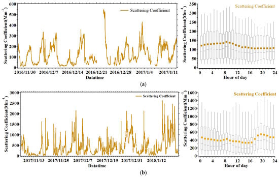 Significant differences in emission sources between northern and southern China lead to distinct impacts on atmospheric aerosol composition and scattering properties during winter. The time series and diurnal variations in the scattering coefficient of submicron particles measured in the Shanghai observation station are shown in Figure 1. The scattering coefficient exhibited a sawtooth-like pattern, ranging from 10.9 Mm−1 to 549.8 Mm−1, with an average value of 120.2 ± 92.3 Mm−1. The diurnal variation in the scattering coefficient exhibited a single-peak pattern, reaching its maximum in the morning between 9:00 and 10:00. This peak is likely influenced by the temperature inversion layer and morning rush-hour emissions, as pollutants accumulate overnight and reach their highest levels in the morning. During the morning rush hour, high traffic volume leads to intensified vehicle emissions.