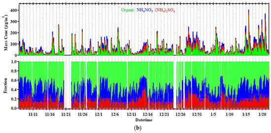 While PM1 scattering often increases with particle mass, mass alone does not guarantee stronger scattering. The magnitude is strongly governed by the size distribution and chemical composition, which together determine the complex refractive index, density, and mixing state []. Changes in their chemical composition can alter both optical and hygroscopic properties, consequently influencing visibility. Investigated aerosol scattering and the contributions of chemical composition in the northern suburbs of Nanjing during the wintertime. They found that particulate mass concentration and aerosol scattering coefficient both increased with pollution levels, showing a strong correlation (correlation coefficient (r) = 0.93) []. The study used the IMPROVE equation to link particulate species with scattering coefficients, finding that ammonium nitrate, ammonium sulfate, and organic aerosols (OA) are the main contributors to pollution in Nanjing’s northern suburbs in winter. Typically, ammonium sulfate and OA are the leading contributors to aerosol extinction, but in some areas, ammonium nitrate can dominate []. In typical environmental conditions in Beijing, ammonium sulfate and ammonium nitrate account for approximately 55% of the scattering coefficient during heavy pollution episodes, significantly more than the 29% contribution from OA []. Meanwhile, ref. [] observed that in Beijing, ammonium nitrate has a greater impact than ammonium sulfate during non-heating seasons, while ammonium sulfate assumes a more prominent role during the heating seasons []. Similarly, for particles with diameters ranging from 0.56 to 1.0 µm, nitrate and sulfate were the most significant contributors to PM (19.4–39.7% and 18.1–34.7%, respectively). Rising nitrate and sulfate concentrations significantly drive pollution events []. In northern areas, especially during the heating period in winter, sulfate and nitrate concentrations are typically high, making substantial contributions to scattering coefficients. In the south, biomass burning and industrial emissions increase OA and nitrate in winter, impacting scattering [,]. However, urban studies in Mexico City found that the larger scattering contribution of organic aerosols during the dry-warm season (73% in total scattering) from February to May than that in the dry cool season, similar to winter (63%). Coincidentally, they also attributed the increase in OA scattering contribution to the arrival of large quantities of aged particles carried by biomass combustion plumes, which occur more frequently during warm seasons [,]. Thus, analyzing submicron particle composition and their role in extinction is crucial.