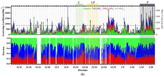 Time series of scattering coefficients and relative contributions of major chemical components in PM2.5 and submicron particles (PM1) during the (a) Shanghai and (b) Dezhou observation period. Period classifications: (P) polluted, (LP) lightly polluted, and (C) clean episodes.