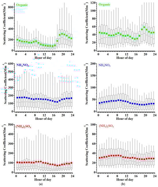 Diurnal variations in scattering coefficients for submicron aerosol (PM1) chemical components in (a) Dezhou and (b) Shanghai. Circles denote mean values; red box-whisker plots indicate median (central line), interquartile range (25th–75th percentiles; box), and 10th–90th percentiles (whiskers).
