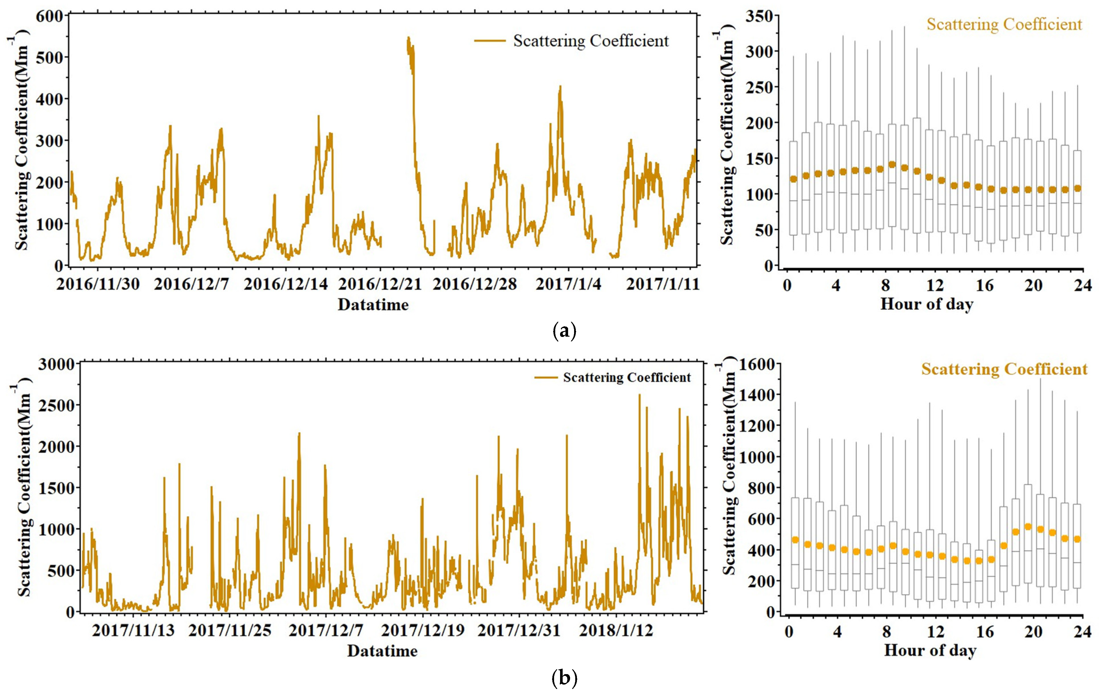 - Hu, X.; Sun, J.; Xia, C.; Shen, X.; Zhang, Y.; Zhang, X.; Zhang, S. Simultaneous measurements of PM1 and PM10 aerosol scattering properties and their relationships in urban Beijing: A two-year observation. Sci. Total Environ. 2021, 770, 145215. [Google Scholar] [CrossRef] [PubMed]
