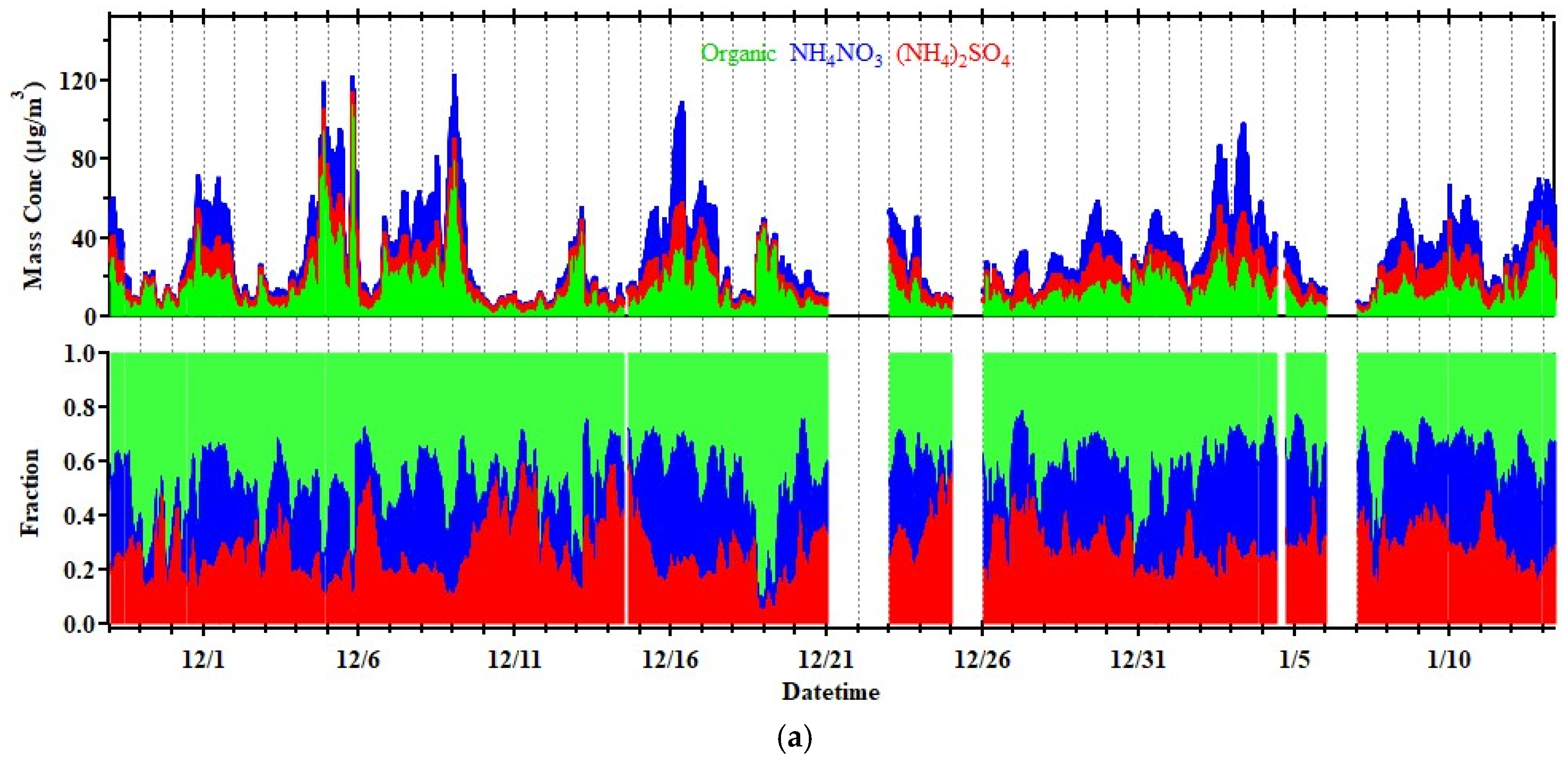- Zhu, W.; Zhou, M.; Cheng, Z.; Yan, N.; Huang, C.; Qiao, L.; Wang, H.; Liu, Y.; Lou, S.; Guo, S. Seasonal variation of aerosol compositions in Shanghai, China: Insights from particle aerosol mass spectrometer observations. Sci. Total Environ. 2021, 771, 144948. [Google Scholar] [CrossRef]