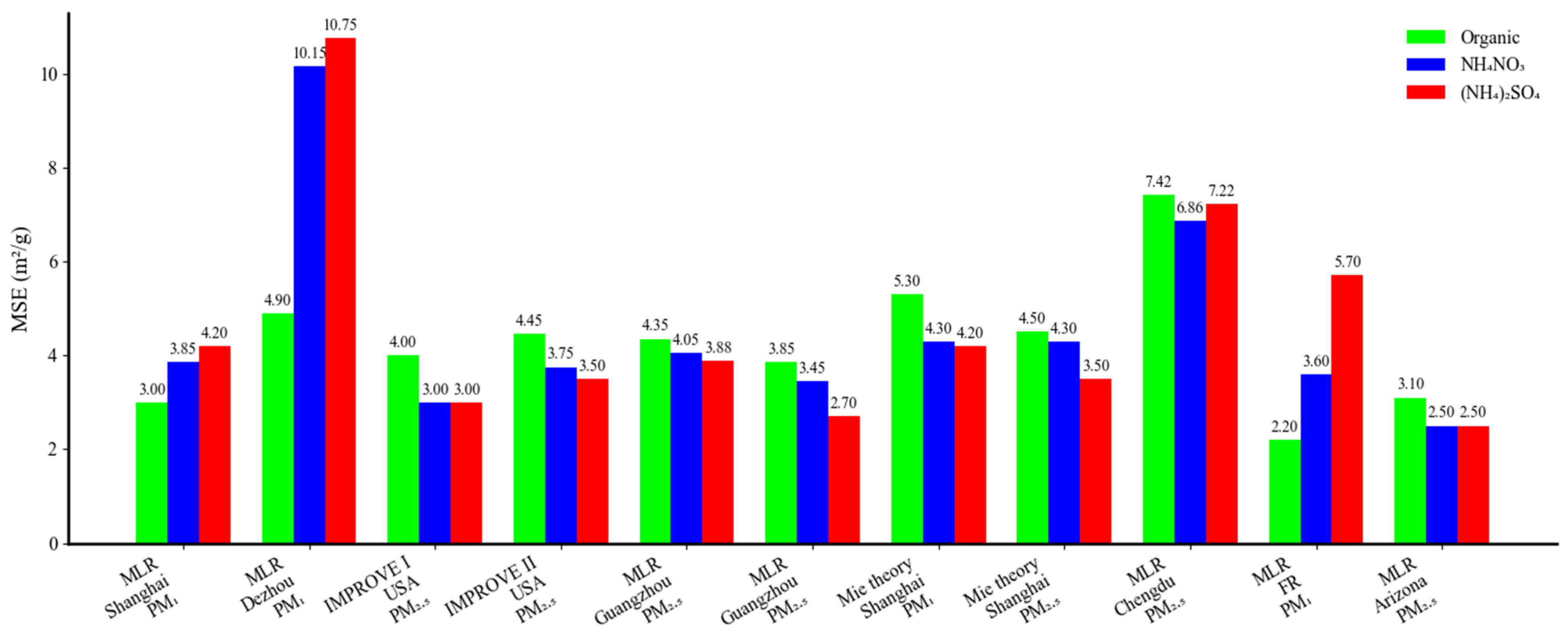 - Latimer, R.N.C.; Martin, R.V. Interpretation of measured aerosol mass scattering efficiency over North America using a chemical transport model. Atmos. Chem. Phys. 2019, 19, 2635–2653. [Google Scholar] [CrossRef]