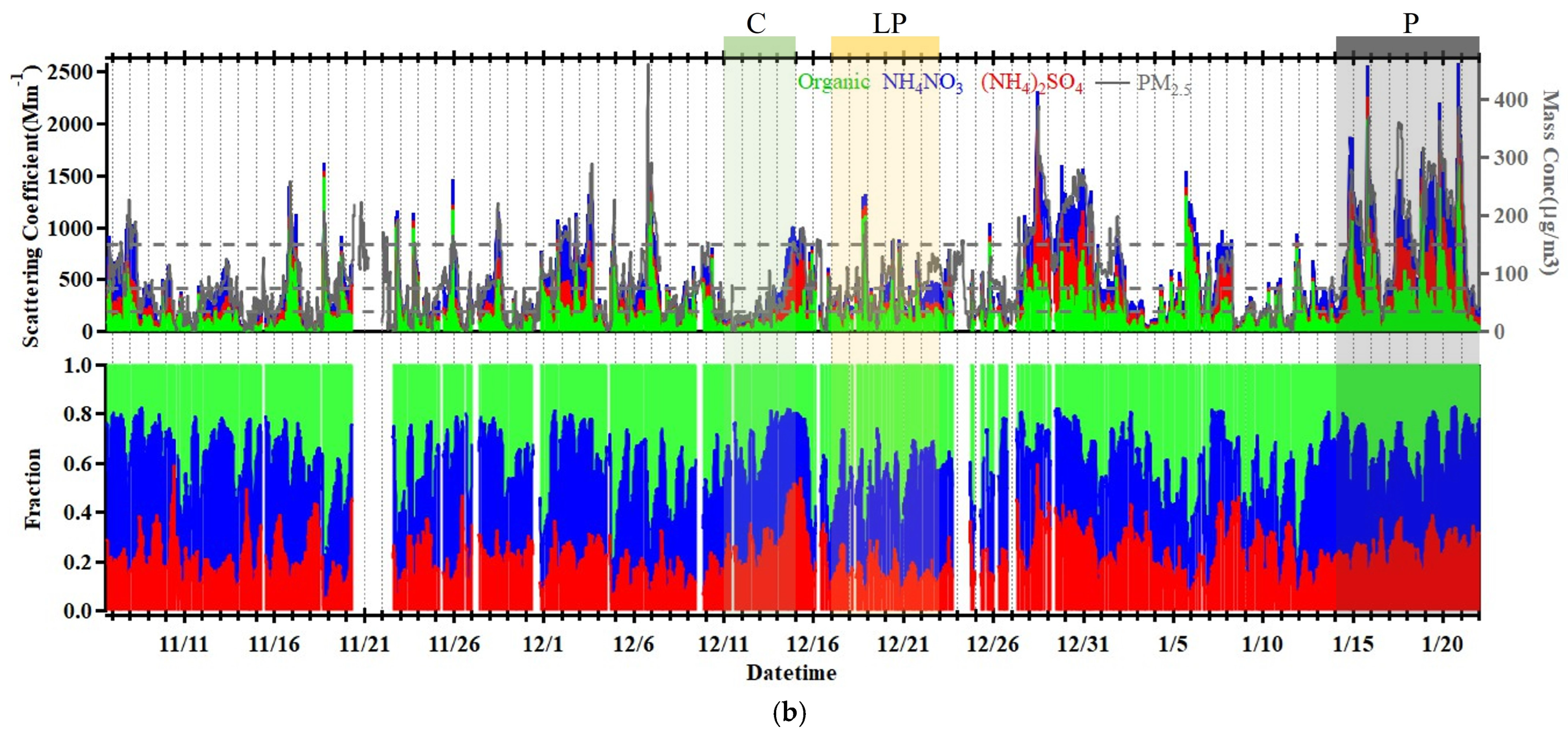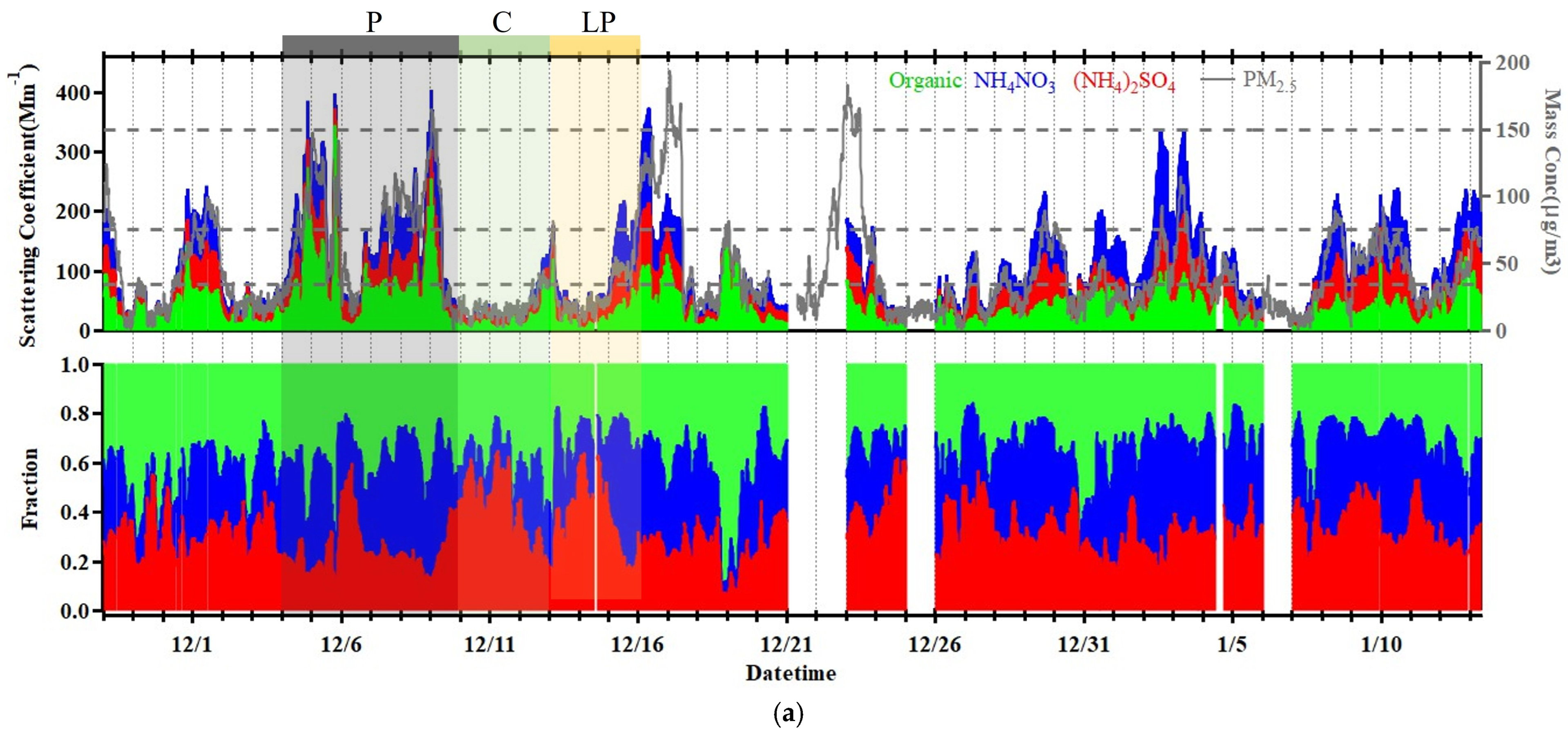 Shi J, Li M, Wang Q, Zhu W, Qiao L, Lou S, Guo S. Scattering Characteristics of Submicron Particulate Chemical Components During Winter in Northern and Southern Chinese Cities. Atmosphere. 2025; 16(11):1302. https://doi.org/10.3390/atmos16111302