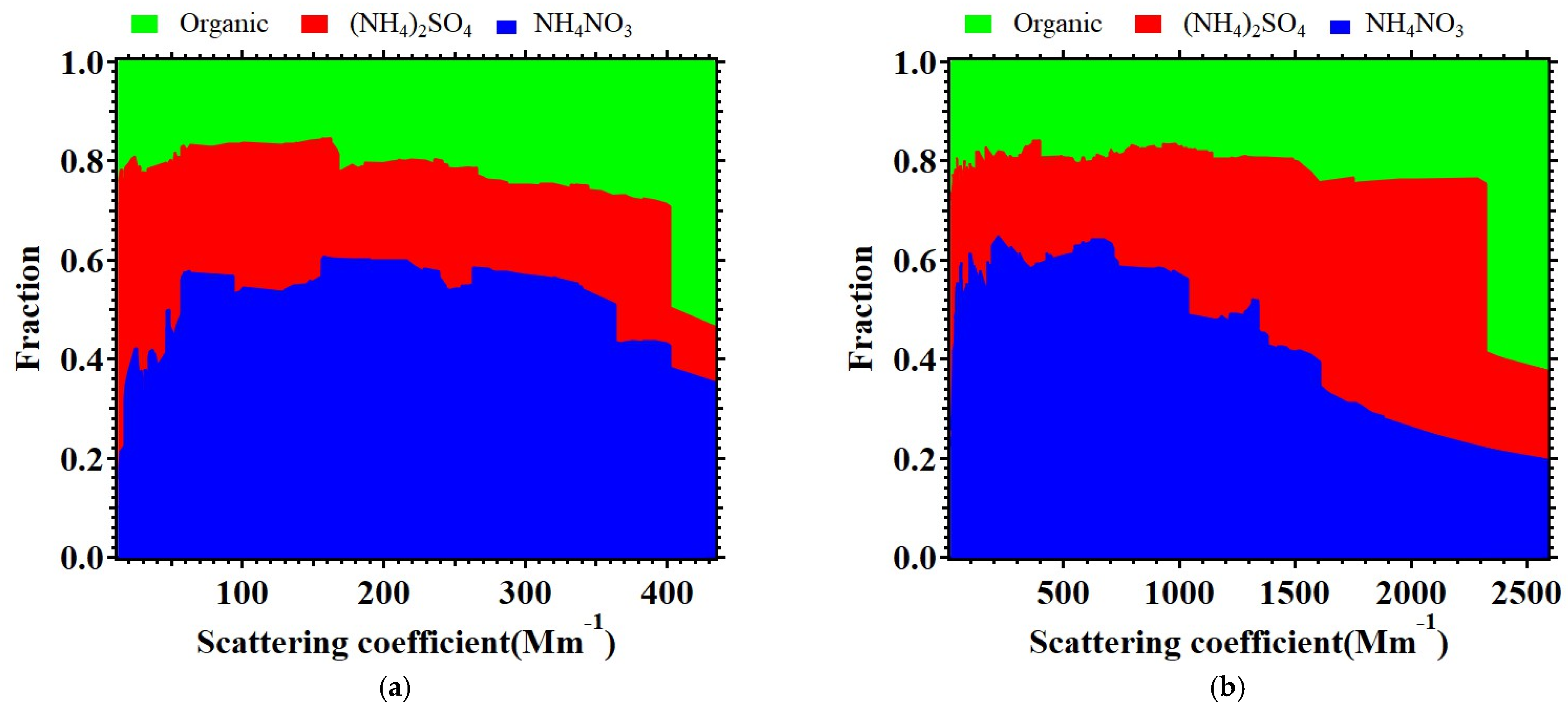 - Chen, D.; Zhao, Y.; Zhang, J.; Yu, H.; Yu, X. Characterization and source apportionment of aerosol light scattering in a typical polluted city in the Yangtze River Delta, China. Atmos. Chem. Phys. 2020, 20, 10193–10210. [Google Scholar] [CrossRef]