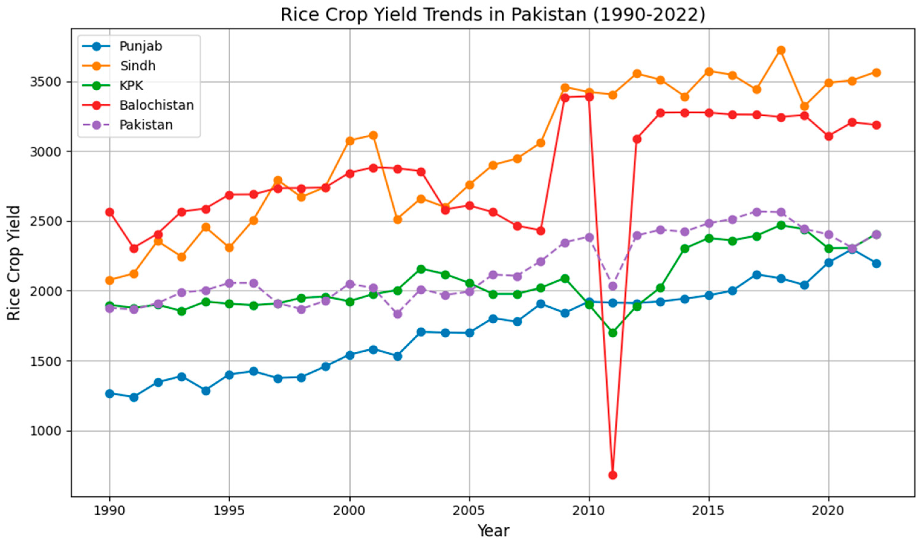 Shah, M.H.; Shah, W.; Syed, S.; Ullah, I.; Wang, Y.; Wang, Y. Impacts of Climate Change on Rice Production in Pakistan: A Perspective from a Deep Learning Approach. Atmosphere 2025, 16, 1305. https://doi.org/10.3390/atmos16111305