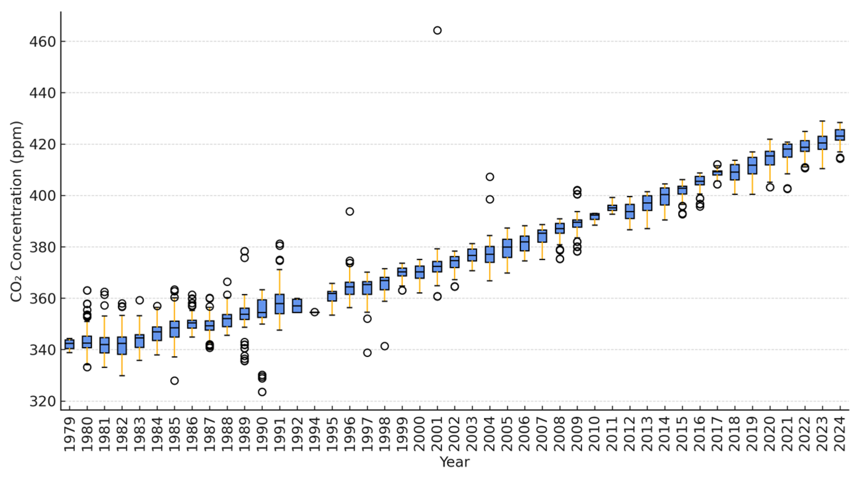 Figure 4. Annual distribution of atmospheric CO2 concentrations measured at the AZR surface flask site (Azores). Each box represents the interquartile range (IQR) for a given year, with the horizontal line indicating the median CO2 concentration. Whiskers extend to the minimum and maximum values within 1.5 × IQR, while individual points beyond this range are shown as potential outliers. The plot illustrates interannual variability superimposed on a persistent long-term upward trend.