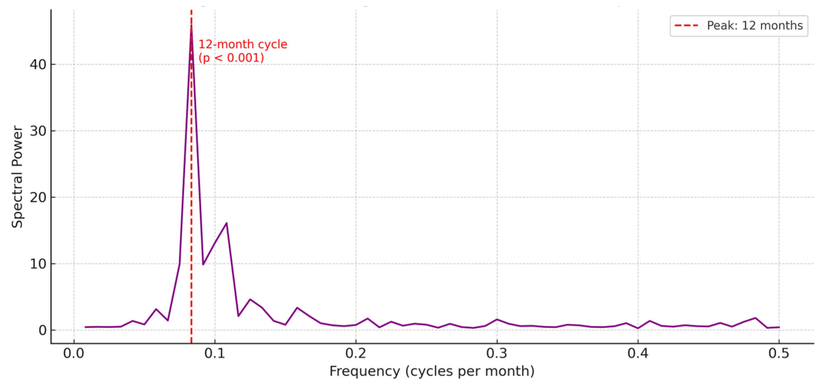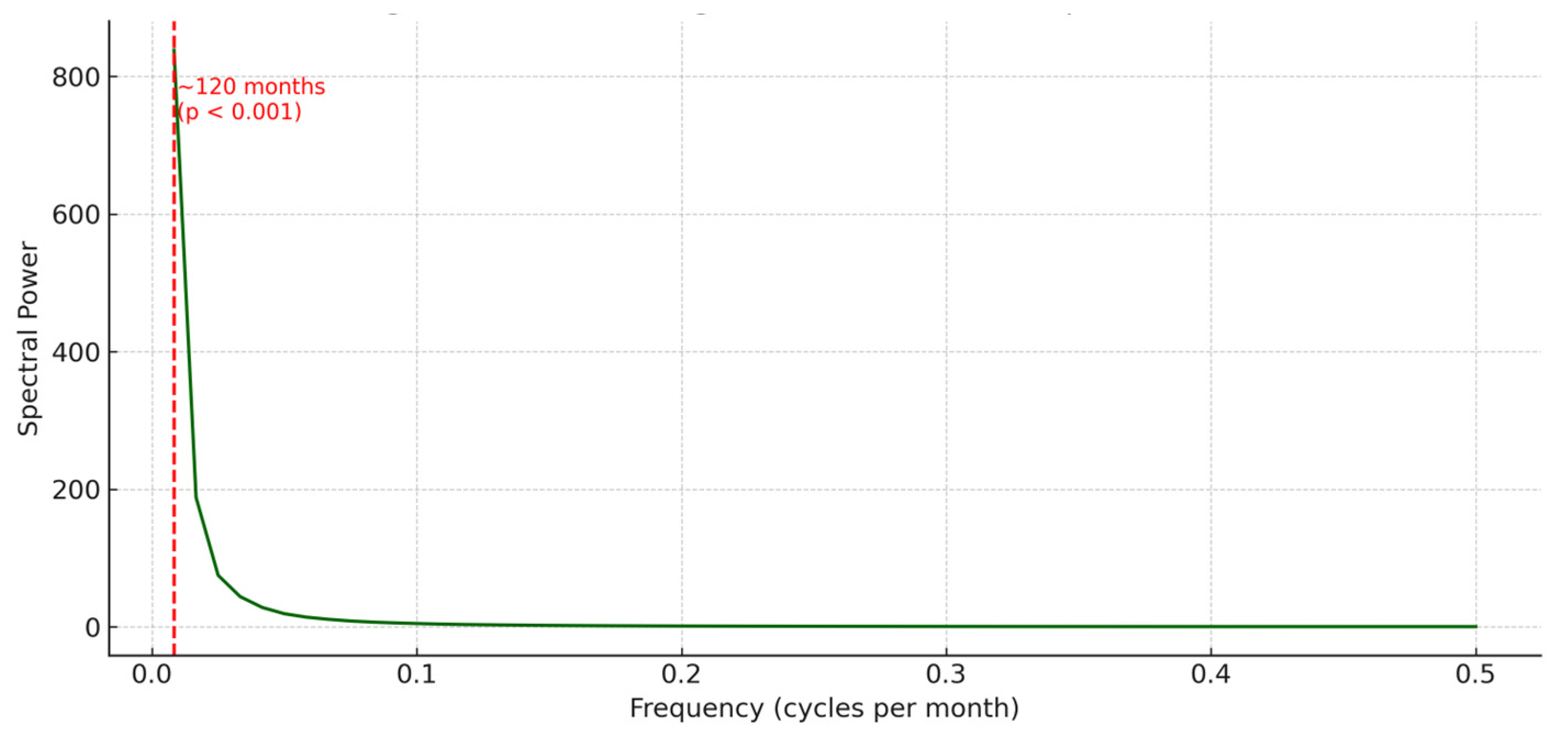 We used the band-power integrated over the decadal band (9–12 years; 108–144 months), computed as the sum of spectral power within [1/144, 1/108] cpm, as a test statistic. We also report the band-power fraction (band-power divided by total spectral power) to normalize across runs [25,26]. The one-sided p-value was estimated as the proportion of surrogates whose band-power fraction was greater than or equal to the observed one [27,29]. This red-noise null avoids the liberal behavior of a white-noise null at low frequencies for autocorrelated climate series [26,27]. For completeness, we also computed the traditional global g-statistic; however, decadal-band inference is based on the band-power test under the AR (1) null [25,26,27].