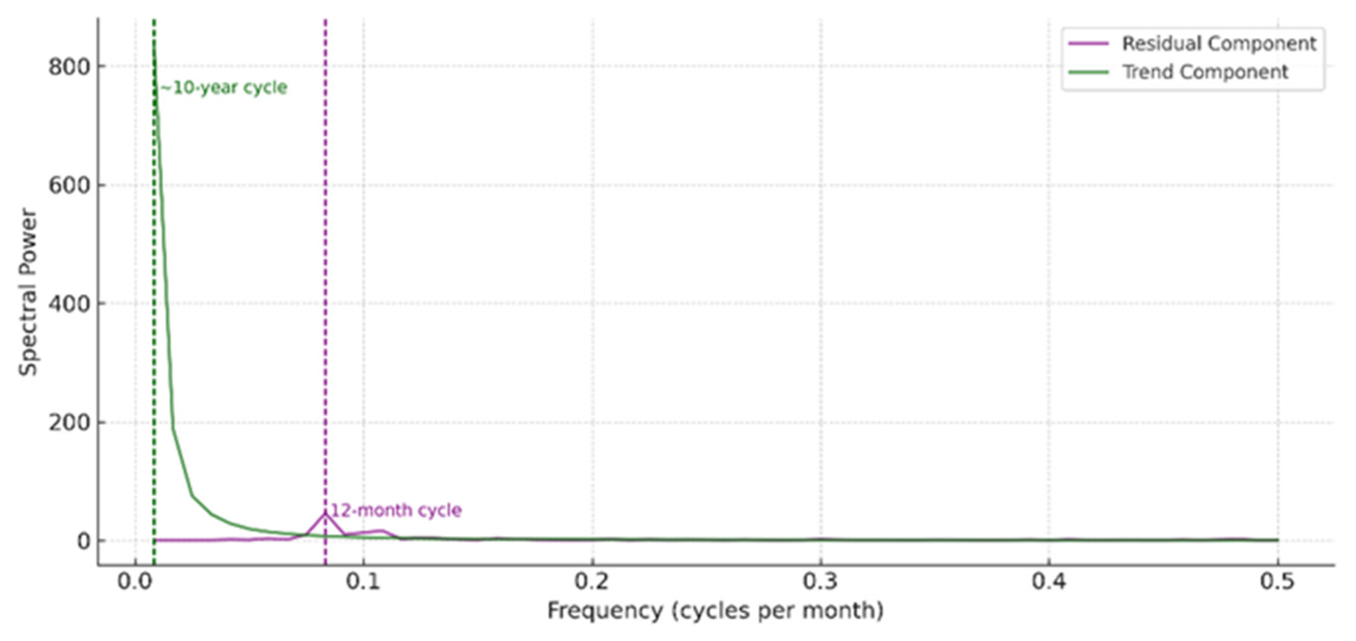 To detect dominant periodicities in the decomposed CO2 time series, we employed the Correlogram-Based Periodogram (CBP) method, a robust spectral analysis technique well-suited for nonstationary and noisy environmental datasets. Unlike traditional periodograms that rely on direct Fourier transformation of the original signal, the CBP first computes the autocorrelation function of the time series and then applies a Fast Fourier Transform (FFT) to the resulting correlogram. Throughout this study, frequencies were initially computed in cpm to match the monthly resolution of the time series. However, for interpretability, dominant periodicities are reported in terms of their corresponding periods (in months), which better reflect the temporal resolution and avoid sub-month interpretations.