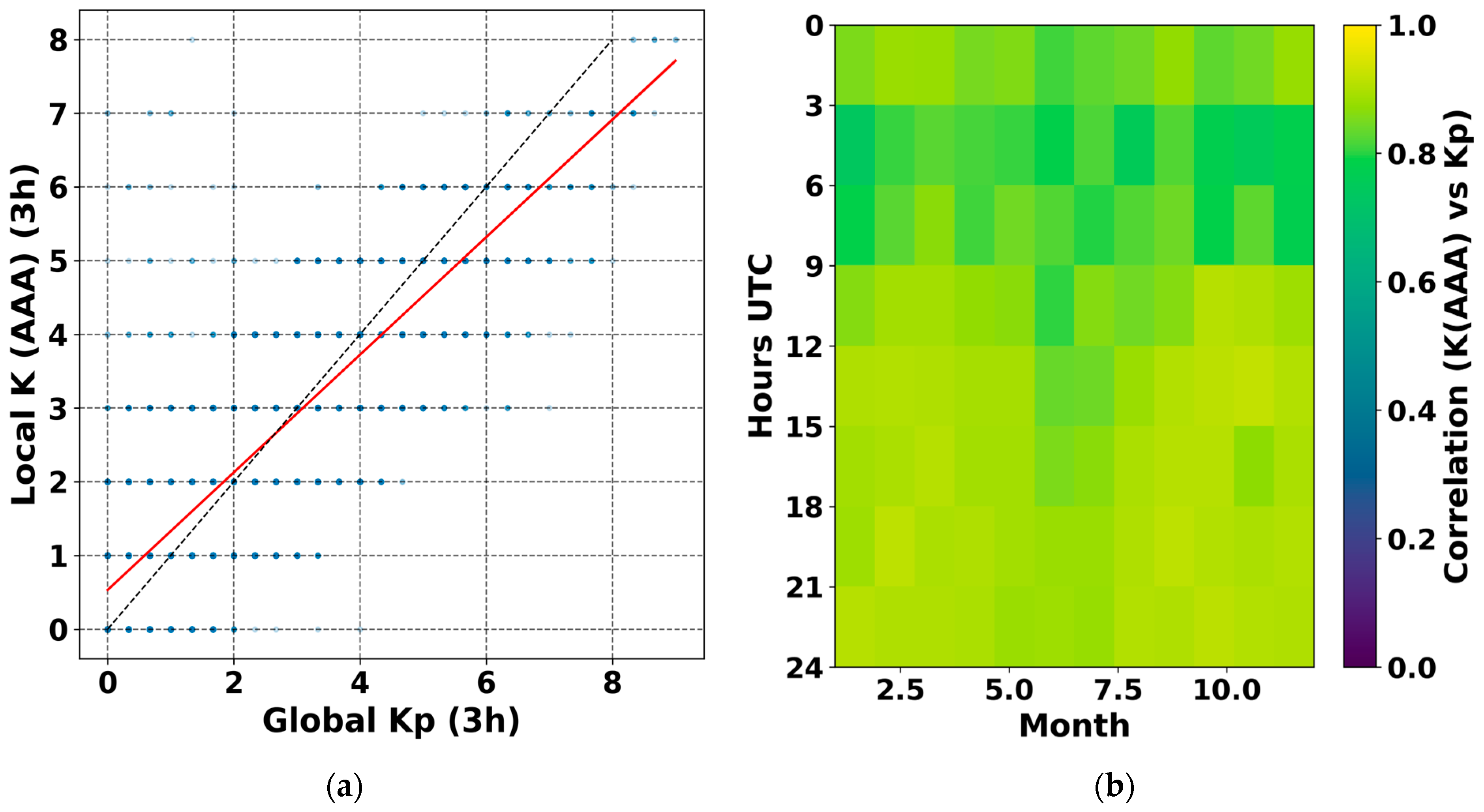 Figure 3b shows a two-dimensional correlation map between the local geomagnetic index K (AAA) and the global Kp index in the coordinates “month × hour (UTC)”. The color scale represents the Pearson correlation coefficient between the two indices, averaged over the entire observation period (2007–2025).