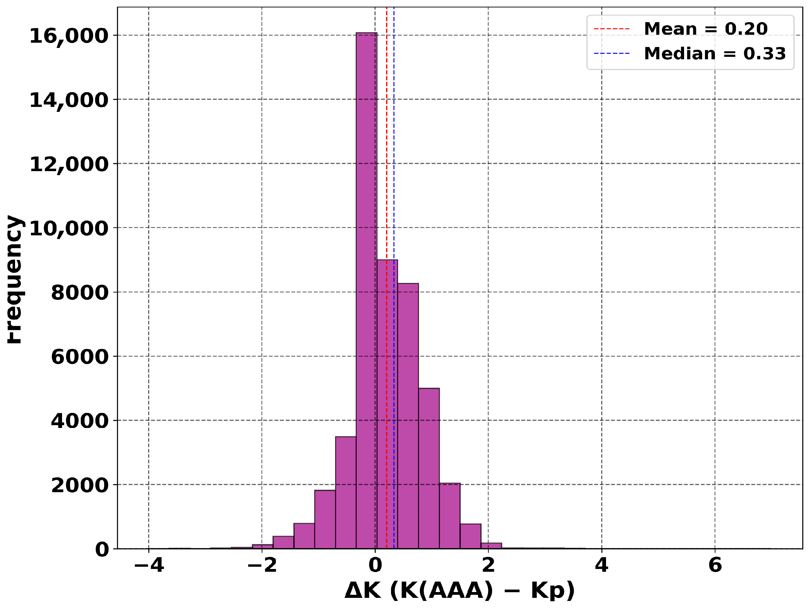 To quantitatively assess the discrepancies, the distribution of differences was calculated as ΔK = K (AAA) − Kp (