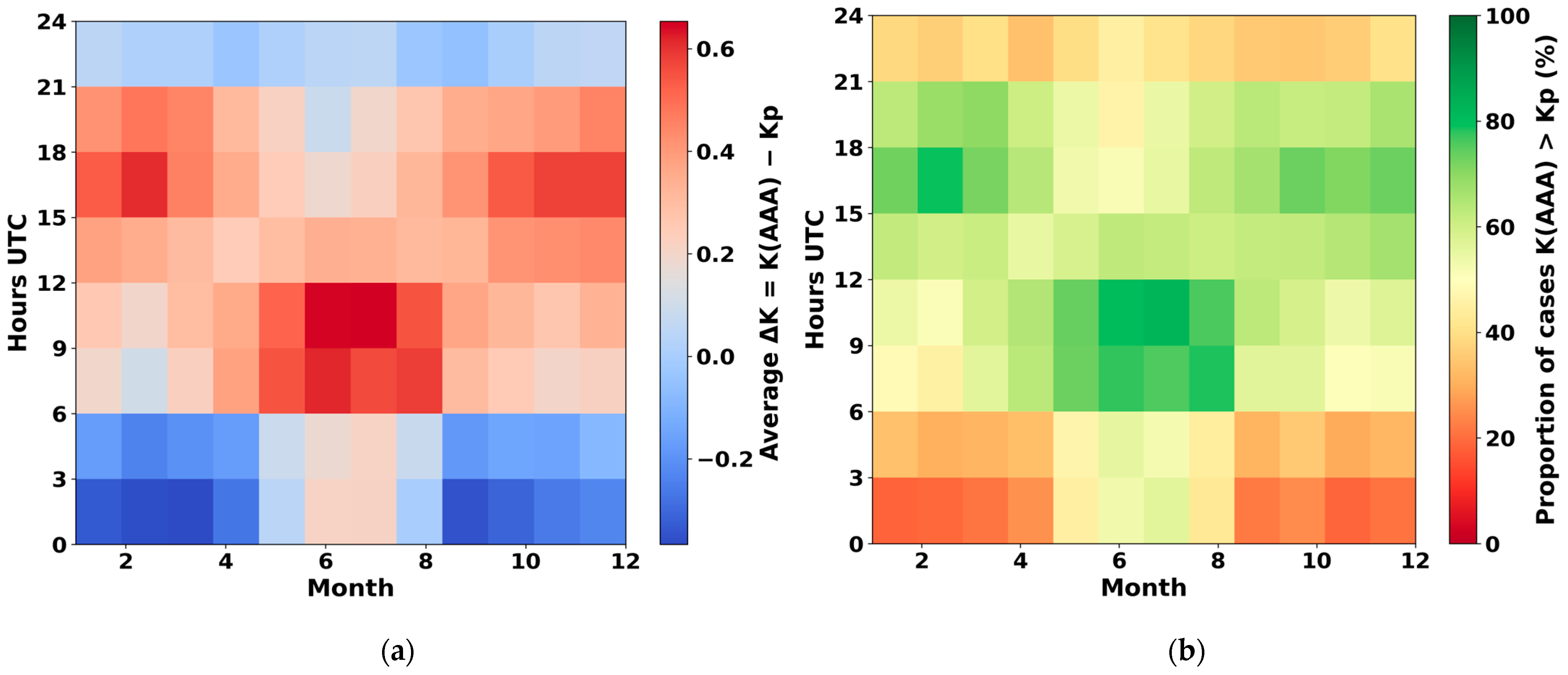 To examine the temporal structure of the discrepancies, the dependence of the offset ΔK = K (AAA) − Kp on month and time of day was analyzed (
