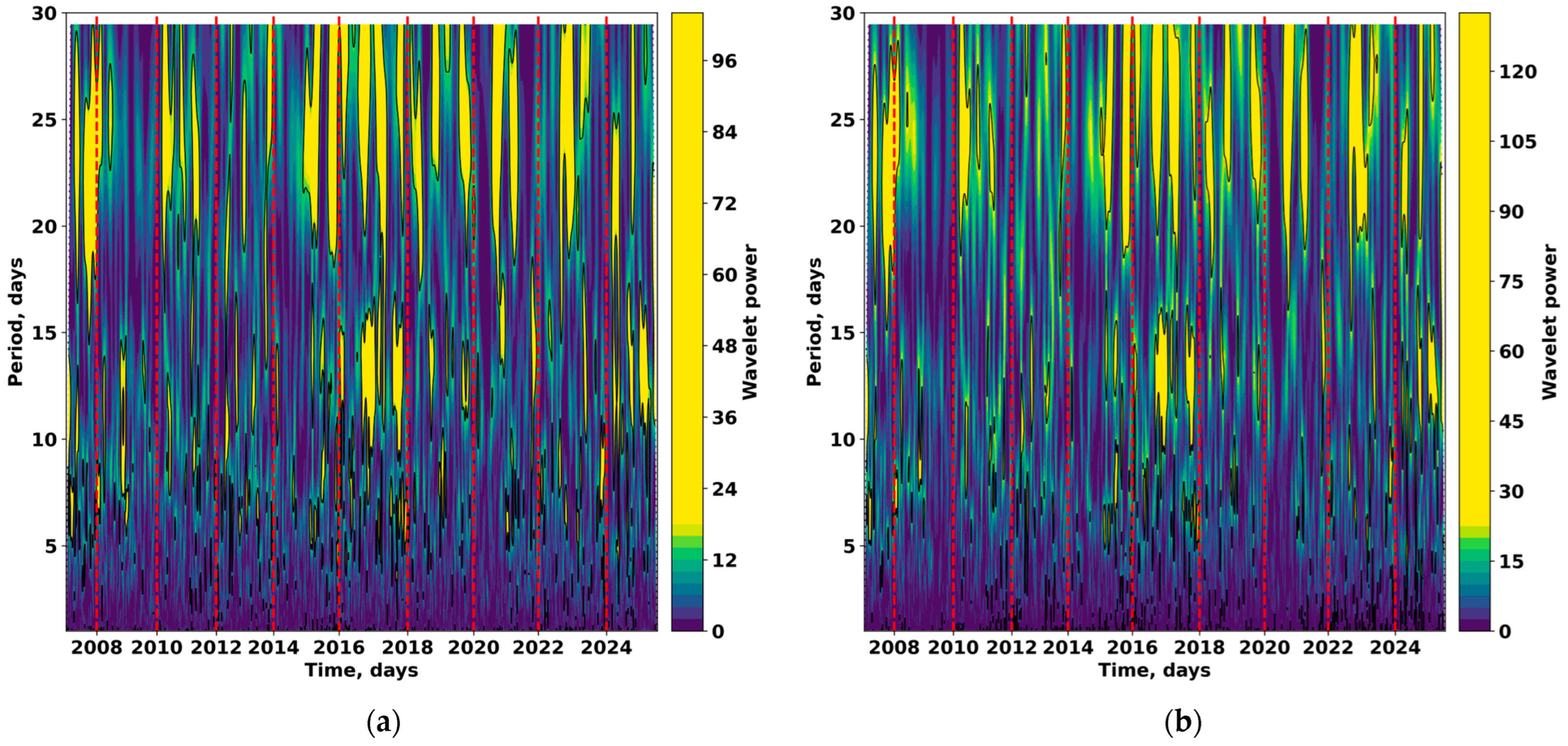 Broader zones of power enhancement at scales of approximately 20–40 days may be associated with seasonal variations in the orientation of the geomagnetic field and the Earth’s axial tilt (the Russell–McPherron effect), as well as with the influence of persistent high-speed solar wind streams recurring with sub-rotational periodicities.