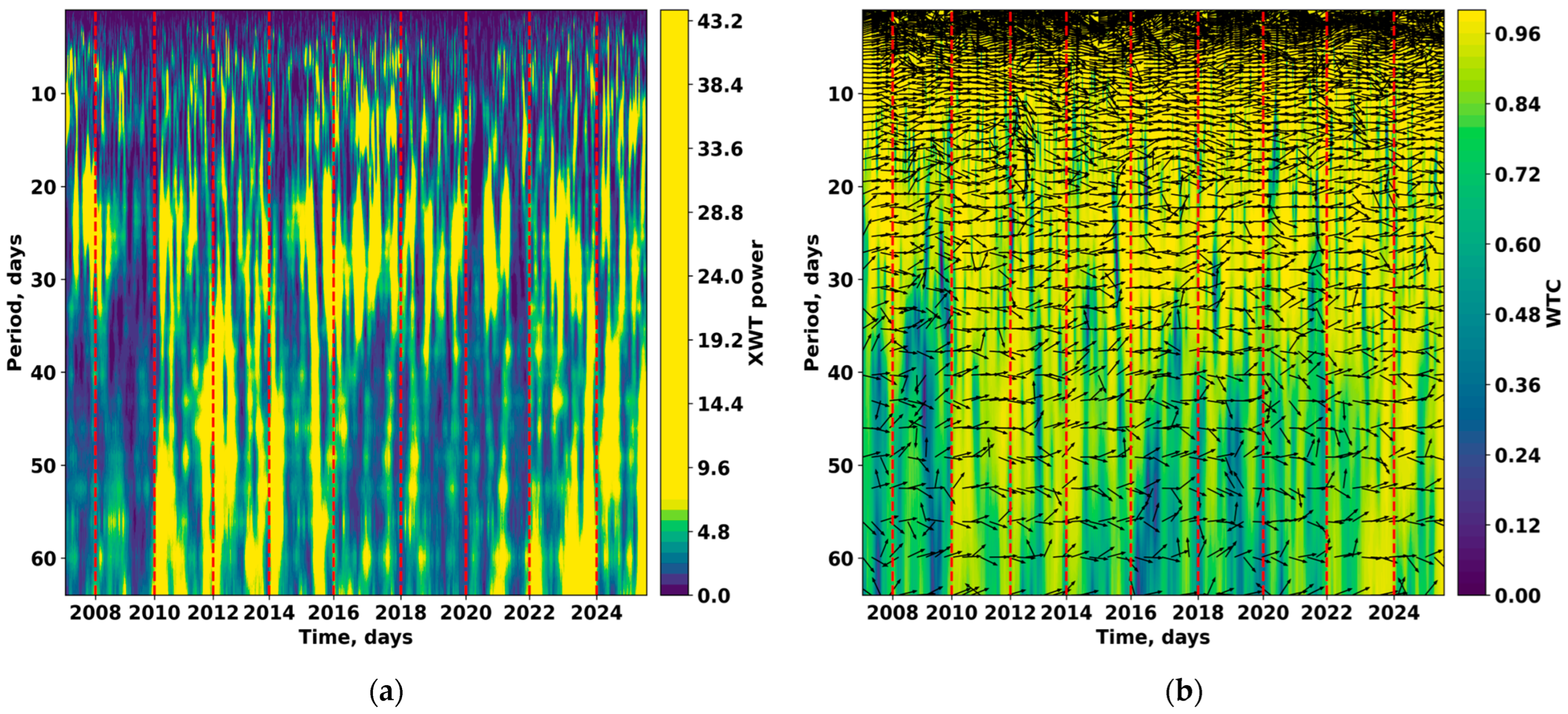 Figure 10a,b illustrate the time-dependent correspondence between the Almaty K (AAA) index and the aggregated global Kp index revealed through cross-wavelet and coherence analyses. The regions of enhanced power and coherence indicate stable in-phase dynamics within the 10–30 day period range, confirming a common solar modulation of both local and global magnetospheric processes.
