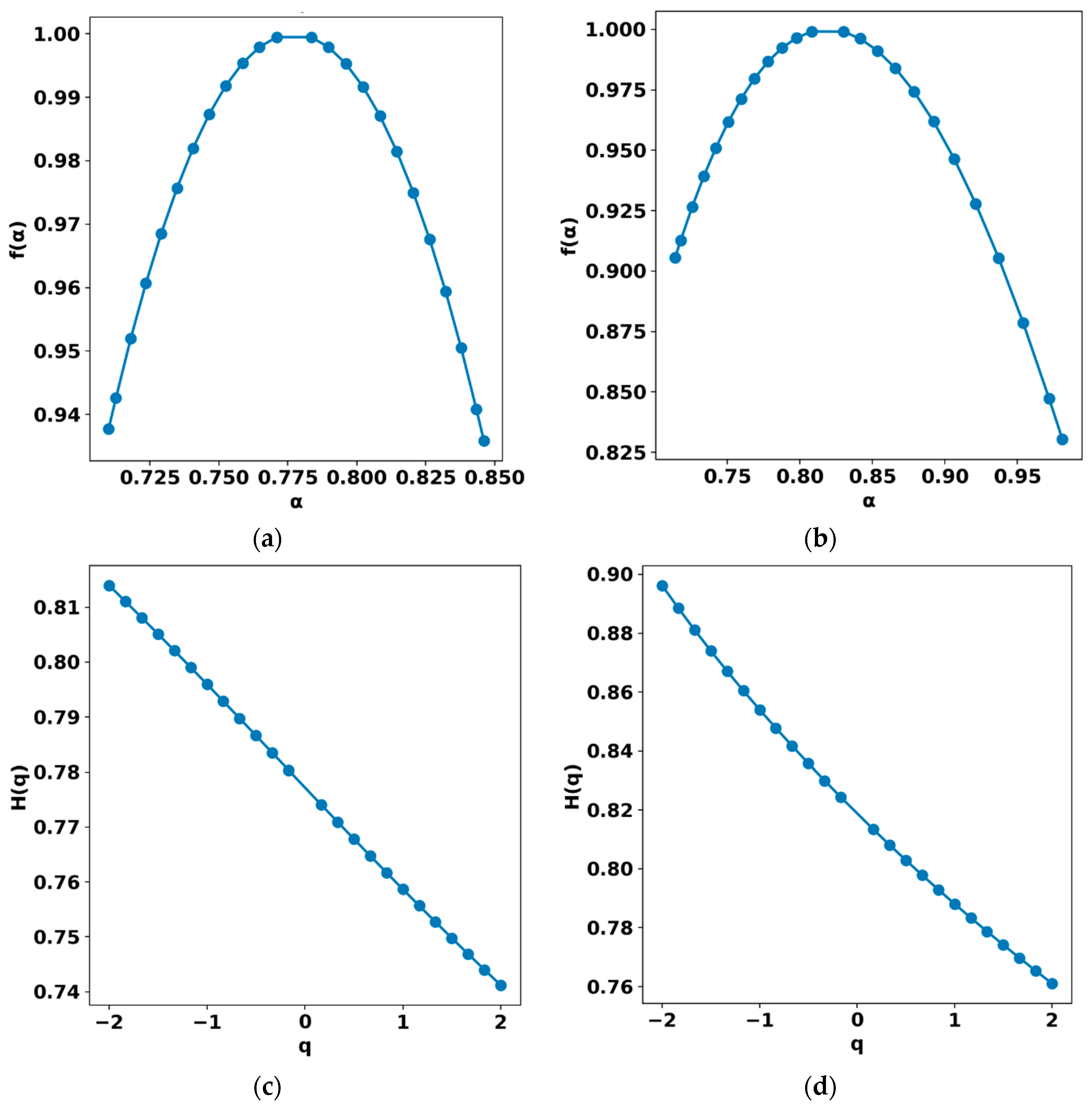 Table 1 presents a summary of the estimated multifractal spectrum parameters, providing a comparative overview of the scaling characteristics and complexity measures for both indices.