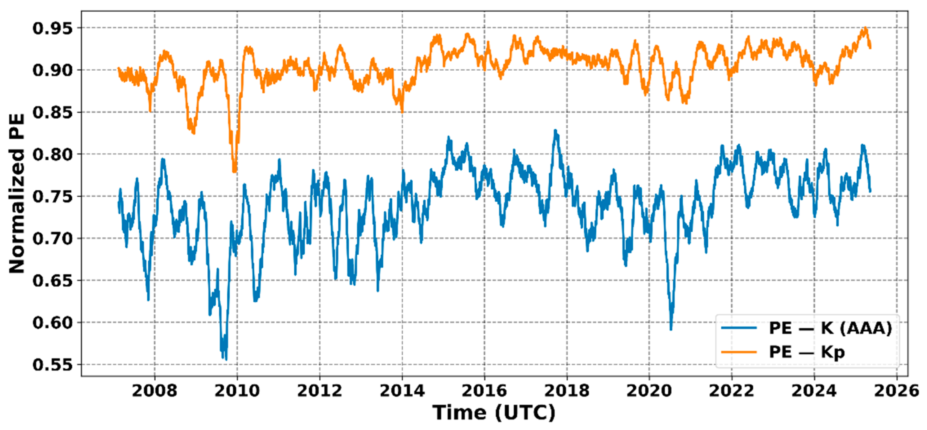 Throughout the entire observation period, the global Kp index exhibits systematically higher PE values, which points to its greater statistical heterogeneity and the spatially integrated nature of global magnetospheric dynamics. The local K (AAA) index, on the other hand, shows more pronounced PE oscillations, indicating the high sensitivity of the single observatory to local geomagnetic effects—including ionospheric currents, conductivity variations, and regional electrojet dynamics.