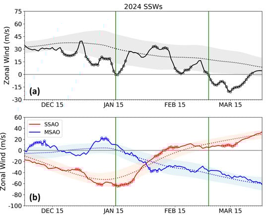 Time evolution of 2023/24 winter zonal-mean zonal wind at 60 N and 10 hPa (a) or averaged over 5 S–5 N (b). The solid lines are the SSW composites, the dotted lines are the climatologies, and the shadings indicate one standard deviation. The red lines represent the stratospheric semi-annual oscillation (SSAO) and pertain to 50 km, while the blue lines represent the mesospheric semi-annual oscillation (MSAO) and pertain to 85 km. The two major SSW onsets are indicated by vertical green lines. Open circles indicate where the statistical significance level is above 95%.
