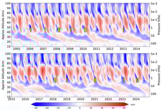 Altitude–time section of zonal-mean zonal wind averaged over 5 S–5 N from 13 August 2004 to 31 December 2024. The unit is m s−1. Orange (green) arrows indicate SSW events occurring when the stratospheric semi-annual oscillation (SSAO) peaks (transits). Years denote January of each year.