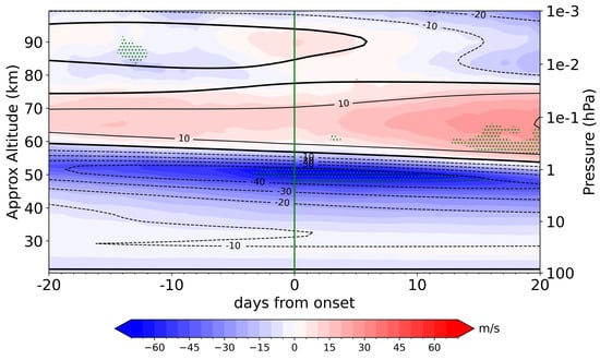 Altitude–time section of SSW composite zonal-mean zonal wind averaged over 5 S–5 N during the SSAO maximum. The unit is m s−1. The filled contours are anomalies, while black contours are the climatology. The interval of the black contours is 10 m/s. Green dots show where the statistical significance level is above 95%.