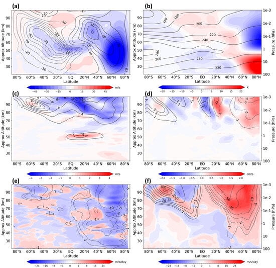 Latitude-altitude cross sections of SSW composites for zonal-mean zonal wind (a), temperature (b), meridional component (c) and vertical component (d) of the residual mean meridional circulation, resolved wave forcing (e), and gravity wave forcing (f) averaged from Day 0 to Day 5 during the SSAO maximum. The filled contours are anomalies, while black contours are the climatologies. The units are m s−1, K, m s−1, cm s−1, m s−1 day−1, and m s−1 day−1, respectively.
