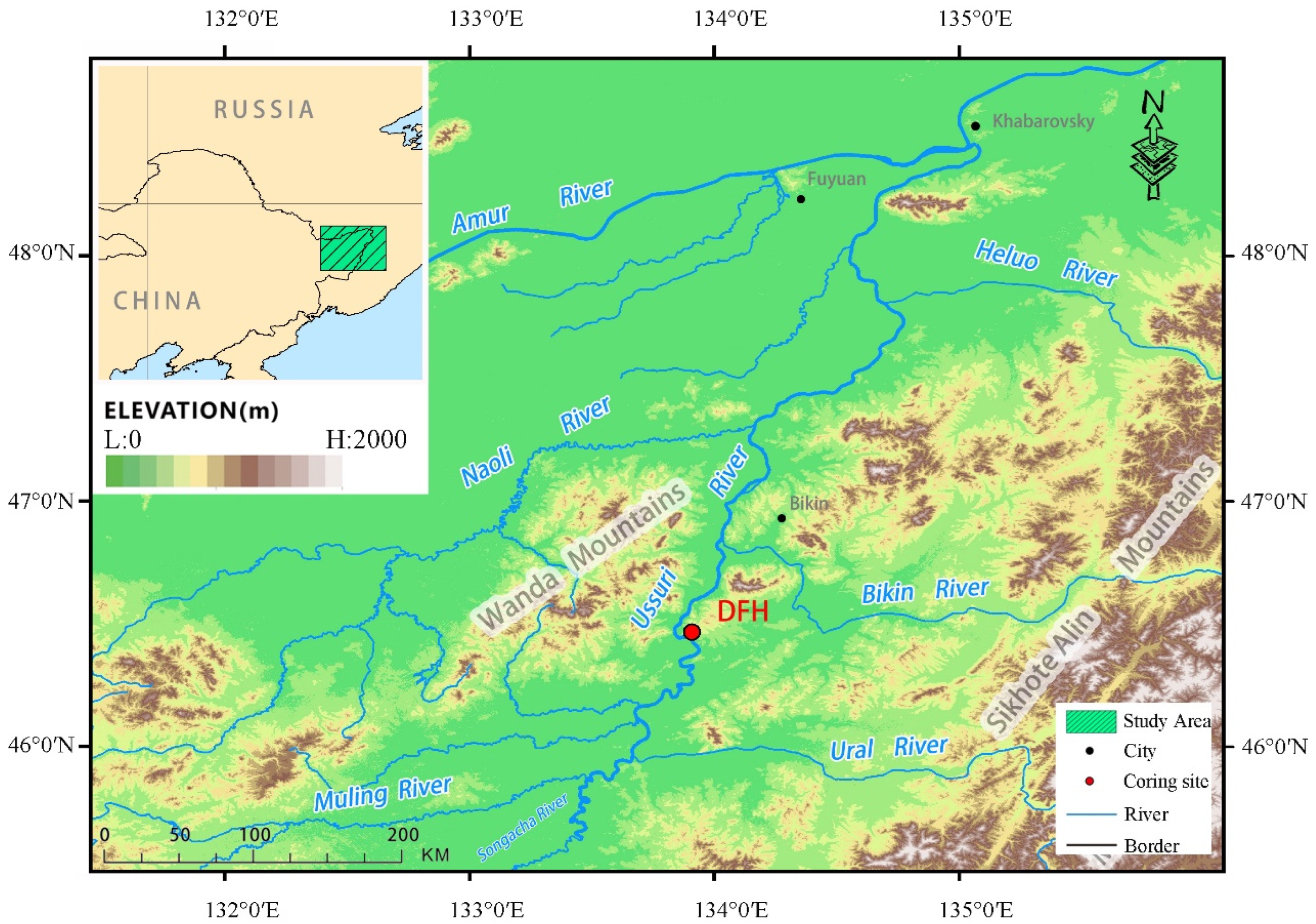 - Zhang, Z.; Yao, Q.; Liu, K.b.; Xu, Q.; Wang, G. Hydrological regime responses to Holocene East Asian summer monsoon circulation in marshes of the Sanjiang Plain, NE China. Land Degrad. Dev. 2020, 31, 240–250. [Google Scholar] [CrossRef]