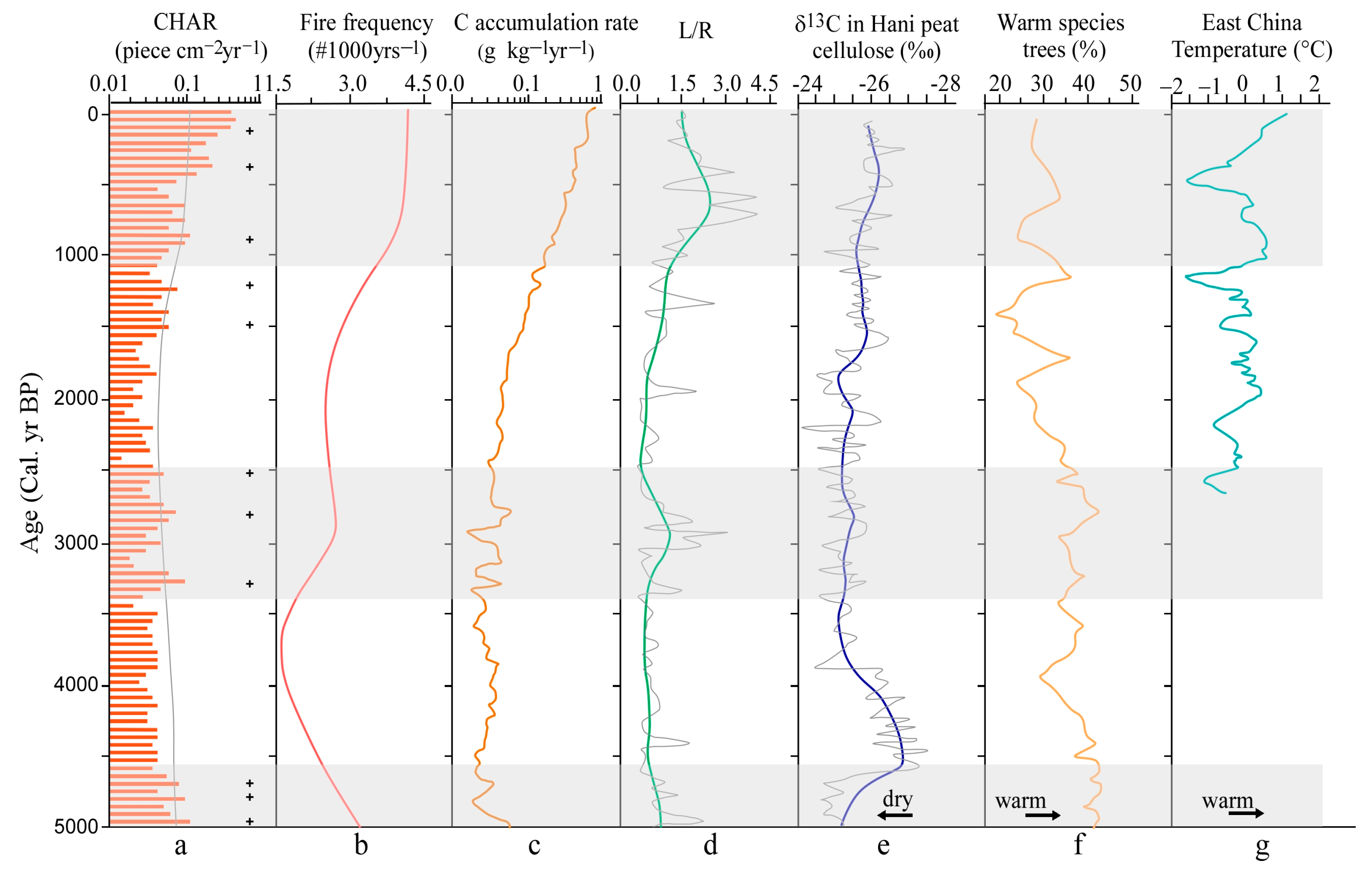 - Wang, X.; Ding, Z. Changes in fire regimes on the Chinese Loess Plateau since the last glacial maximum and implications for linkages to paleoclimate and past human activity. Palaeogeogr. Palaeoclimatol. Palaeoecol. 2012, 315, 61–74. [Google Scholar] [CrossRef]
