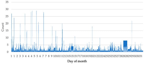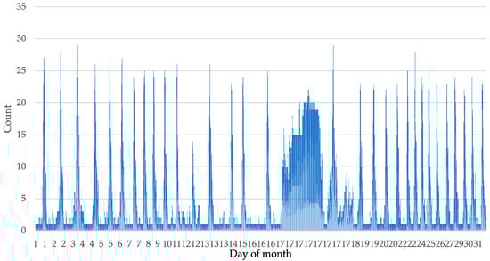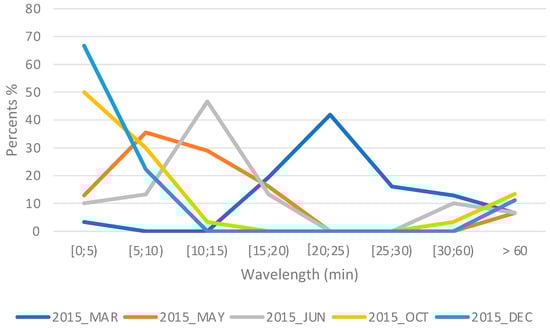 It is necessary to select an algorithm to detect the presence of regular waves in these monthly data subsets. Based on the example of March 2015, daily regular waves are repeated with a 4.5-min lag on a time scale graduated in 1.5-min increments. For better transparency, the count of clouds and waves is depicted in Figure 5.
