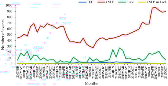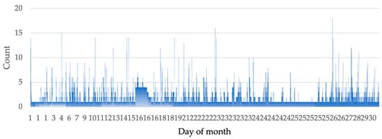 The results of the experiments were summarized and are shown in Figure 10 and Table A1. A sample of summarized search results in the month of November 2011 is shown in Table 5. The column “Stations” represents the number of stations in the cloud, and “Stations/Cloud” in six columns indicates the search results in six experiments. For control purposes, numbers for “Stations/Cloud” indicate the number of stations recording a cloud that coincide with data in column “Stations”. The column “Adj. Days’ Time Lag (min)” shows the difference in minutes (min) between the identified cloud of regular waves in adjacent days (current minus previous). Information on lines 31–33 represents clouds in one wave, lines 50–54 indicate another regular wave, lines 114–115 indicate another very small wave, and lines 127–130 indicate one more wave. Complete information for this data subset for the month of June 2014 is presented in Table A1, where the summarized search results of the selected month are shown.