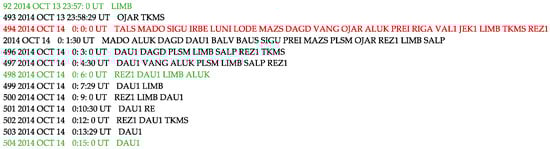 The first row presents information on the number of scintillation events, the date and time, and a list of Latvian CORS DOMEs where ionospheric scintillation causing a 3D positioning discrepancy ≥ 10 cm occurred simultaneously. The second row represents information on the next event, which occurred within the next 90 s. The various subsets of stations represent the area of the station network impacted by different sizes of electron clouds. Therefore, the information subset of each row is called a cloud, and the whole sequence of uninterrupted 90 sec events of ionospheric scintillation is called a wave (evil wave []). Over the course of a day, wave counts may vary depending on solar activity.