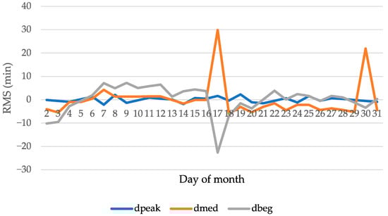 Linear approximation errors for the daily timing (min) of the peak, median, and beginning.