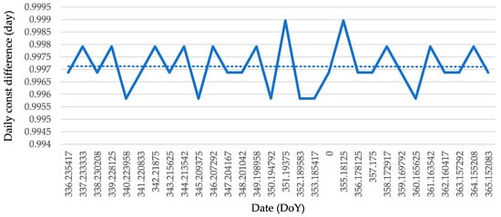 Doubts and disbelief about the regularity of scintillation led to its existence being repeatedly tested. The search conditions were not fundamentally different. The differences were only the change in the choice of the starting point cloud or in the choice of the regular daily repetition time shift constant (Const). By changing the Const value, the number of identified waves per month changed. In the search process with a different Const value, a peak cloud was always the starting point. However, in search of the subsequent day’s wave, a different cloud of the same wave was used instead of the peak cloud because of its fluctuating time. In months with shorter wavelengths, the search process collapsed, as the accepted time Const shifted beyond the limits of the next wave. In Figure 9, the fluctuation in the time of peak cloud and the subsequent variation in Const value are depicted. The dashed line shows the mean Const that is close to the length of the sidereal day.