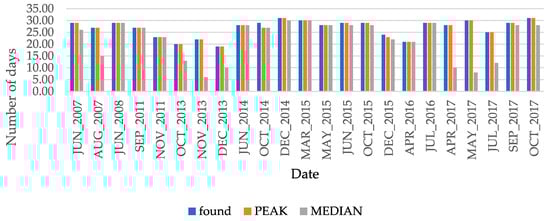 Because it was not possible to detect regular ionospheric scintillation waves on all days in some months, a linear approximation of the time series of detected waves was performed for peak clouds, median clouds, and initial (beginning) clouds. The approximation for initial clouds showed the most significant errors, rendering its use for forecasts invalid. The number of input data for peak and median clouds is shown in Figure 10.