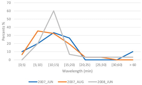 The period was selected from the first to the last MJD day, during which regular disturbance was identified over the course of a month. For better visibility, Figure 12, Figure 13, Figure 14, Figure 15, Figure 16 and Figure 17 show the distributions of wavelengths mentioned in Table 7 for each year. These graphs illustrate the dependence of the wavelength distribution on solar geomagnetic activity. Solar activity decreased in 2007 and 2008 (Figure 12), but it was still relatively high.
