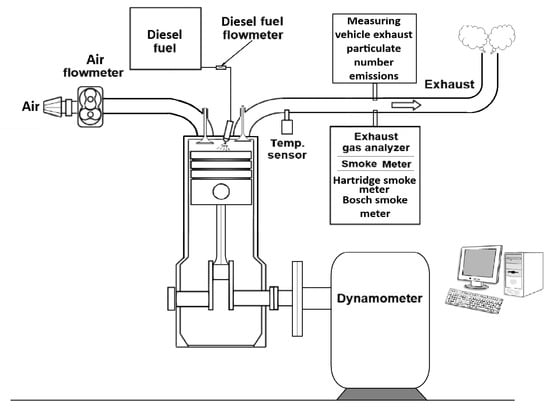 The 1.9 VW engine, mounted on a dynamometer stand, was free-flowing (without catalysts, DPFs, and mufflers), and all parameters and indicators of the engine and dynamometer brake were monitored during the experiments (Figure 7).