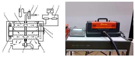 The engine is coupled to a direct-current brake VEM-VEB (VEM-VEB (Starkstrom-Anlagenbau Karl-Marx Stadt))—SAK 50, with a maximum braking power Pb = 50 kW, at a speed of n = 4000 min−1. The brake dynamometer measures the braking force Fb, with an accuracy of 1.96 N. The braking force is used to calculate the engine power indexes: rated power—Pe, kW; effective torque Te, N·m; and mean effective pressure pme, MPa. Figure 1 shows a scheme of the experimental setup of the study.