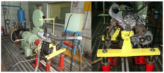 Test bench with the direct-current SAK 50 brake and VW 1.9 engine—Photograph taken by the authors during the experimental setup; no external source.