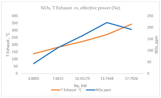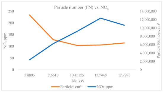 Figure 8 illustrates the inverse dependence between particle number concentration (PN, particles·cm−3) and nitrogen oxides (NOx, ppm) as a function of the engine’s effective power (Ne, kW). The data clearly show that as the brake power increases from approximately 3.9 kW to 17.8 kW and NOx emissions rise steadily, while the particle number concentration decreases sharply, particularly within the low-to-medium load range.