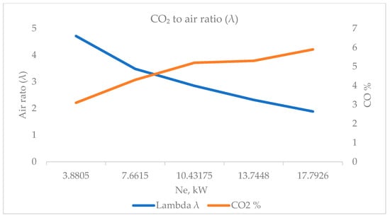 From the point of view of the CO2 content to the air ratio (λ), the same trend is observed again. At low loads of the diesel engine and operation with lean fuel–air mixtures, the CO2 content in the exhaust gases is low. This is a direct consequence of the fact that with more air, there is better fuel combustion, which leads to these low CO2 levels. When the load increases and the fuel mixture becomes leaner, the CO2 content increases, which is due to an increase in the amount of fuel burned and a deterioration in the combustion process. Figure 9 shows the relationship between CO2 and the air ratio (λ).