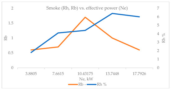 The results obtained in terms of smoke (Figure 10) from the exhaust gases, measured by the Bosch method (Rb), showed that with increasing effective power to medium loads, smoke increases. After that, there is a clearly visible trend of decreasing smoke at high loads. The trend of increasing smoke with increasing load is also maintained by the Hartridge method (Rh), and when reaching the highest loads, it is seen that smoke decreases. This is most likely due to the enrichment of the mixture, the increase in temperature and pressure in the combustion chamber, and the temperature of the exhaust gases. As a result of these engine operating conditions, there are favorable processes of burning smaller soot particles in the combustion chamber and their unification into larger amorphous compounds of carbon atoms, which leads to a decrease in the total smoke and soot concentration. The difference in determining smoke density using the two measurement methods is most likely due to the fact that the Bosch method (Rb) is more sensitive and accurate for the sample and reflects the moment of its collection. The Hartridge method (Rh) for determining smoke density is latent and represents an average value for the time it takes to burn 30 mL of fuel.